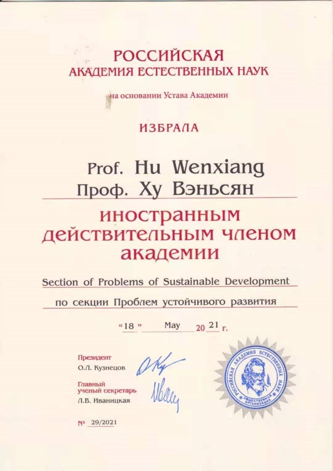 首席專(zhuān)家胡文祥當(dāng)選俄羅斯自然科學(xué)院外籍院士
