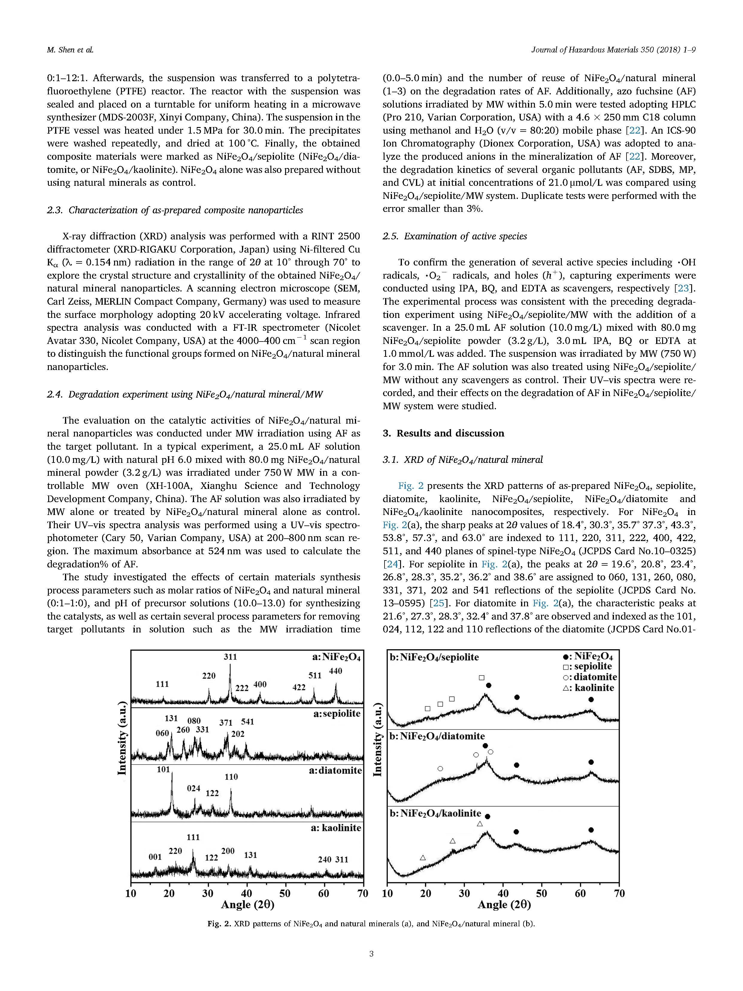 本研究采用微波水熱法制備了尖晶石-NiFe2O4/天然礦物(海泡石、硅藻土和高嶺石)復(fù)合材料,并將其應(yīng)用于十二烷基苯磺酸鈉(SDBs)、偶氮胂(AF)、甲基對(duì)硫磷(MP)等有機(jī)污染物的微波催化降解(NiFe2O4/天然礦物/mw)中,以及溶液中的結(jié)晶紫(CVL)。