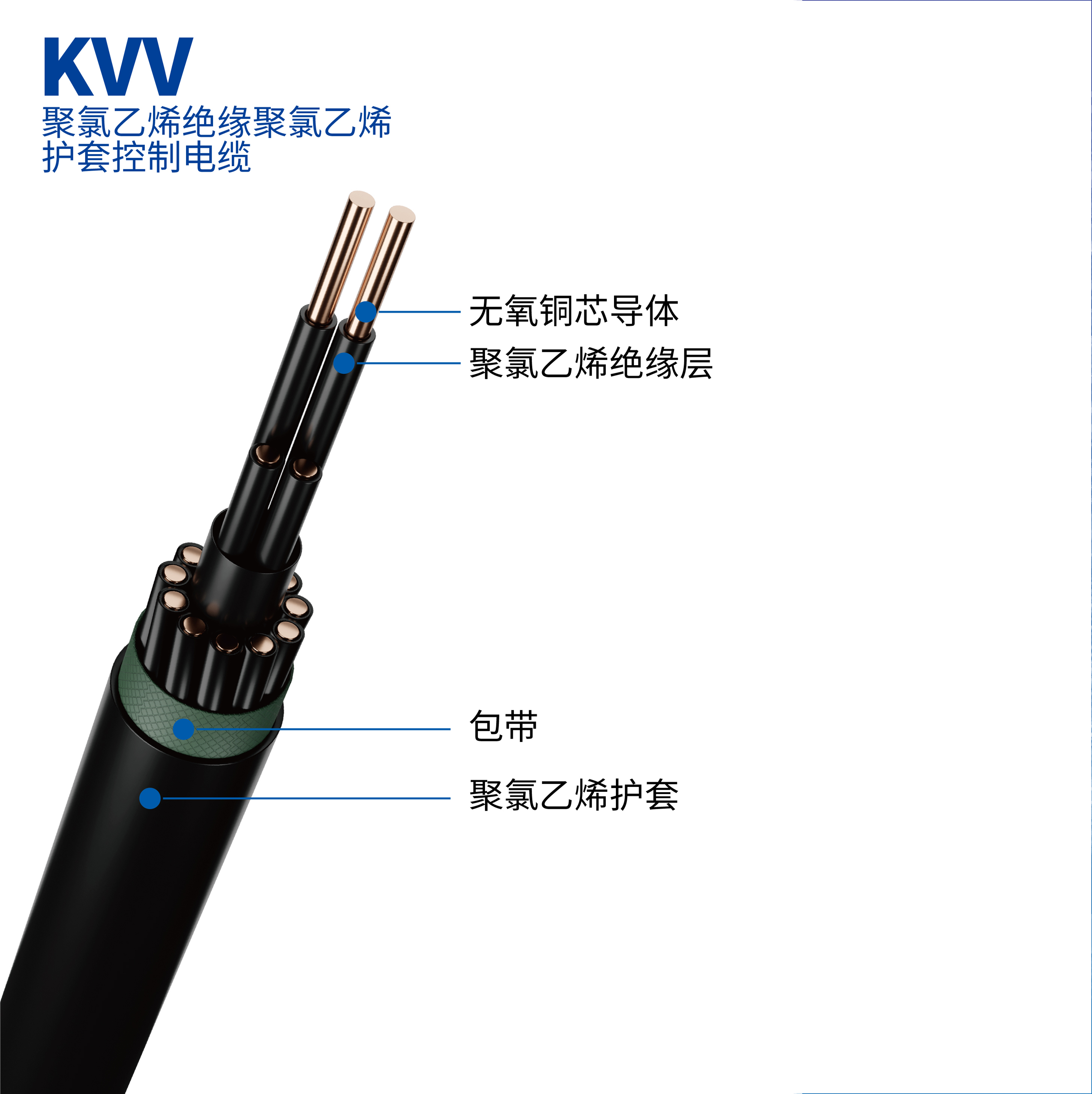 字母含義:K:控制電纜系列代號(hào);第1個(gè)V:聚氯乙烯絕緣;第2個(gè)V:聚氯乙烯護(hù)套