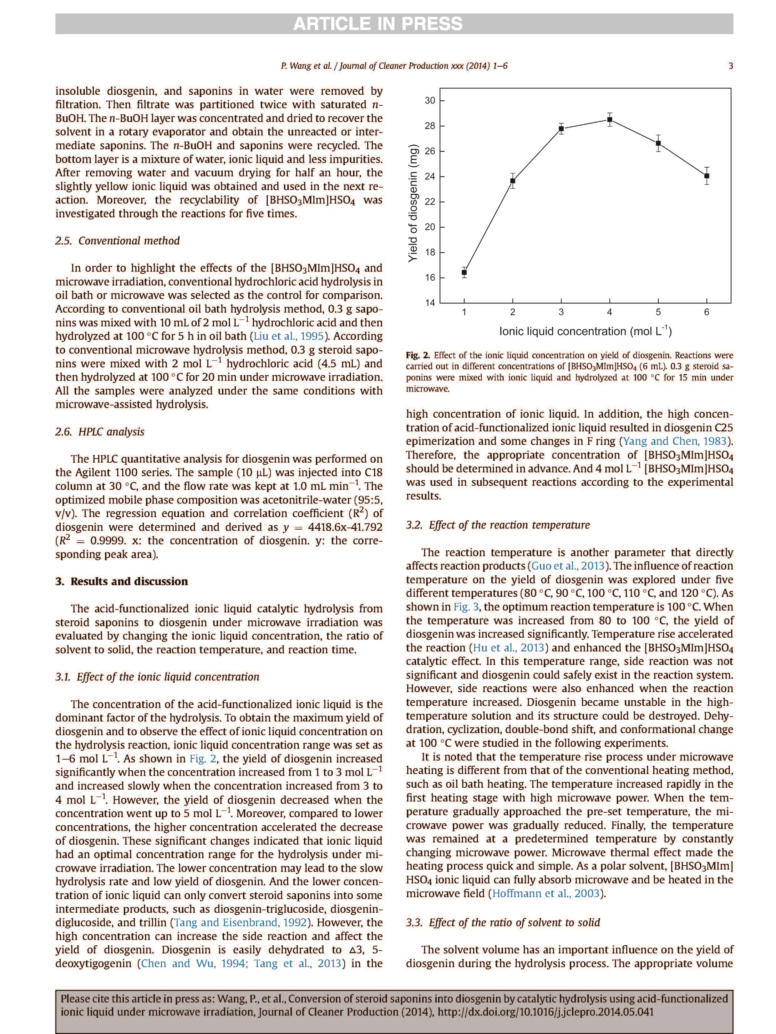 以酸功能化離子液體為催化劑,在微波輻射下成功地將甾體皂甙元轉(zhuǎn)化為薯蕷皂甙元。采用典型的1-磺丁基-3-甲基咪唑氫硫酸鹽離子液體([BHSO3MIm]HSO_4),對水解條件進(jìn)行了優(yōu)化。最佳反應(yīng)條件為:4 mol L1[BHSO3MIm]HSO 4,溶劑與固體的比為15:1,反應(yīng)溫度為100℃,反應(yīng)時間為20 min。在最佳條件下,以0.3g甾體皂苷為原料,薯蕷皂甙元收率最高,為29.97±0.51mg。與常規(guī)鹽酸水解法相比,該方法具有以下三個優(yōu)點。首先,該方法以常規(guī)鹽酸水解得到了近似的產(chǎn)率,反應(yīng)時間縮短了93%。第二,所有的水解溶劑都是環(huán)保和可回收的。酸功能化離子液體取代了傳統(tǒng)的鹽酸,大大減輕了環(huán)境污染.第三,[BHSO3MIm]HSO_4離子液體穩(wěn)定有效,三次循環(huán)后僅略有下降。對未反應(yīng)底物也采用有效的回收方法進(jìn)行回收。綜上所述,該方法在薯蕷皂甙元生產(chǎn)中具有廣闊的應(yīng)用前景。