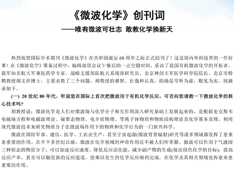 北京祥鵠科技 熱烈祝賀《微波化學》創(chuàng)刊并獲國際刊號