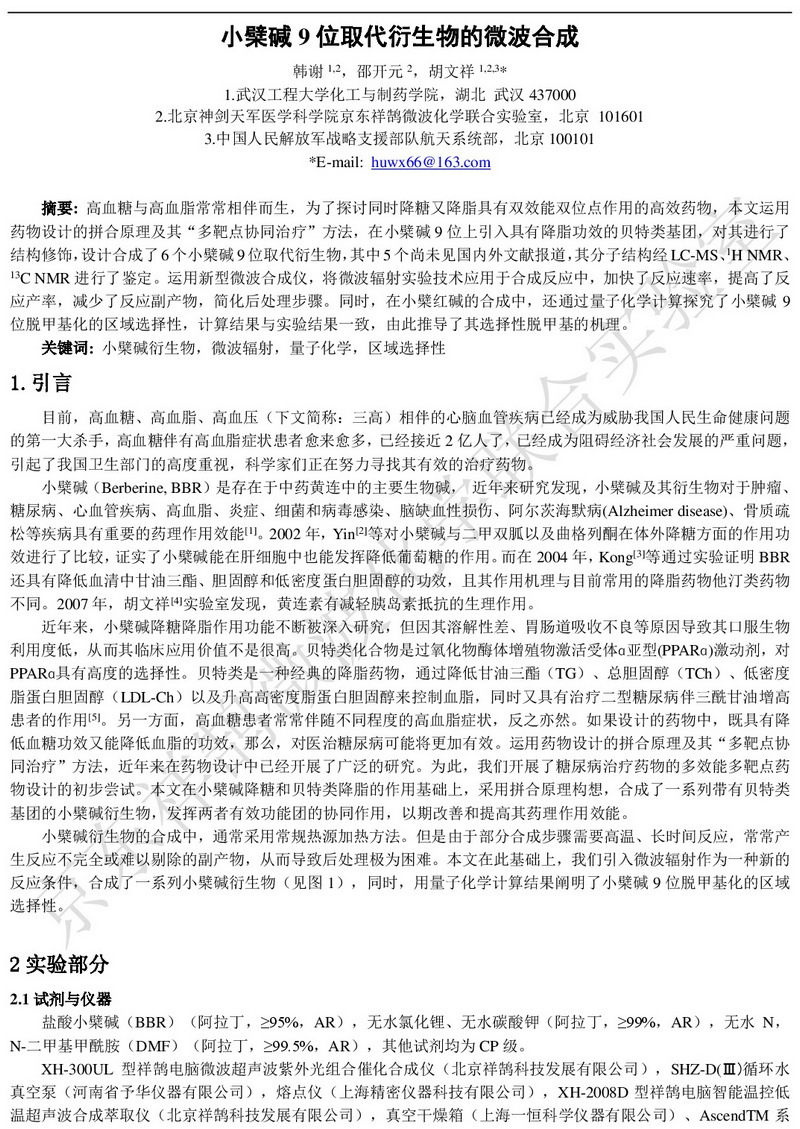 我國有機微波化學(xué)的開拓者、中國工程院院士正式候選人胡文祥教授指導(dǎo)的武漢工程大學(xué)研究生韓謝同學(xué)在北京神劍天軍醫(yī)學(xué)科學(xué)院京東祥鵠微波化學(xué)聯(lián)合實驗室,在邵開元教授的具體指導(dǎo)下,利用祥鵠微波化學(xué)儀器,成功合成了一系列新化合物,取得了良好結(jié)果,其英文論文剛剛發(fā)表在由國際著名的斯普林格出版社出版的高等學(xué)?;瘜W(xué)研究英文版上,收到良好反響!韓謝在攻讀碩士學(xué)位期間,十分努力,發(fā)表學(xué)術(shù)論文10余篇,論文數(shù)量在全校研究生中位居前列。這里作者將其英文論文翻譯成中文,供廣大學(xué)者參考。不妥之處,敬請廣大專家和讀者批評指正!