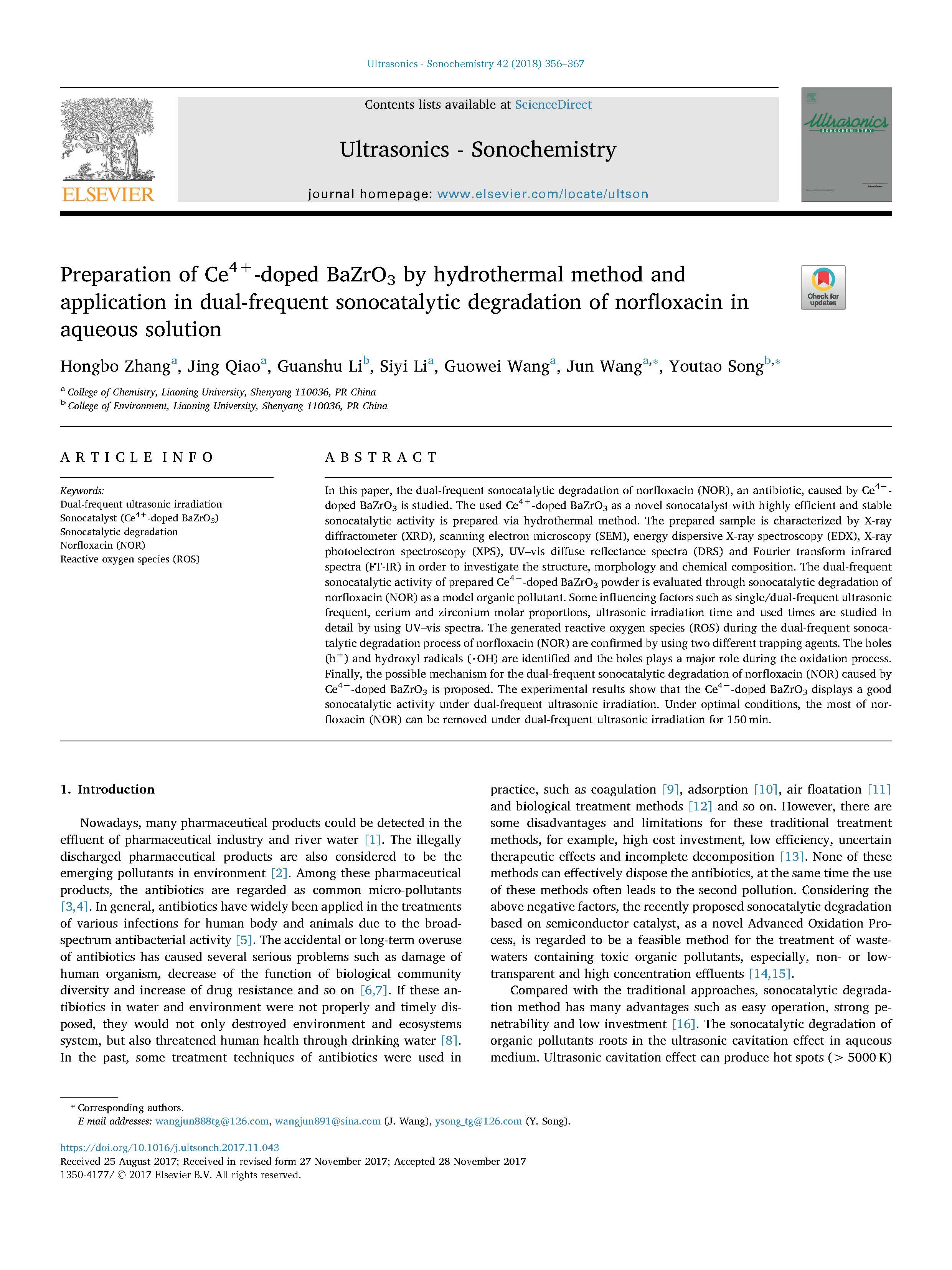 用X射線衍射儀(XRD)、掃描電鏡(SEM)、能量色散X射線能譜(EDX)、X射線光電子能譜(XPS)、紫外-可見(jiàn)漫反射光譜(DRS)和傅里葉變換紅外光譜(FT-IR)對(duì)樣品進(jìn)行了表征。通過(guò)對(duì)諾氟沙星(NOR)作為模型有機(jī)污染物的超聲催化降解,考察了制備的Ce4摻雜BaZrO 3粉體的雙頻聲催化活性。利用紫外-可見(jiàn)光譜對(duì)單/雙頻超聲頻率、鈰、鋯摩爾比、超聲輻照時(shí)間和使用次數(shù)等影響因素進(jìn)行了詳細(xì)研究。采用兩種不同的誘捕劑對(duì)諾氟沙星(NOR)雙頻超聲催化降解過(guò)程中產(chǎn)生的活性氧(ROS)進(jìn)行了確證。確定了孔洞(H)和羥基自由基(%OH),在氧化過(guò)程中空穴起主要作用。