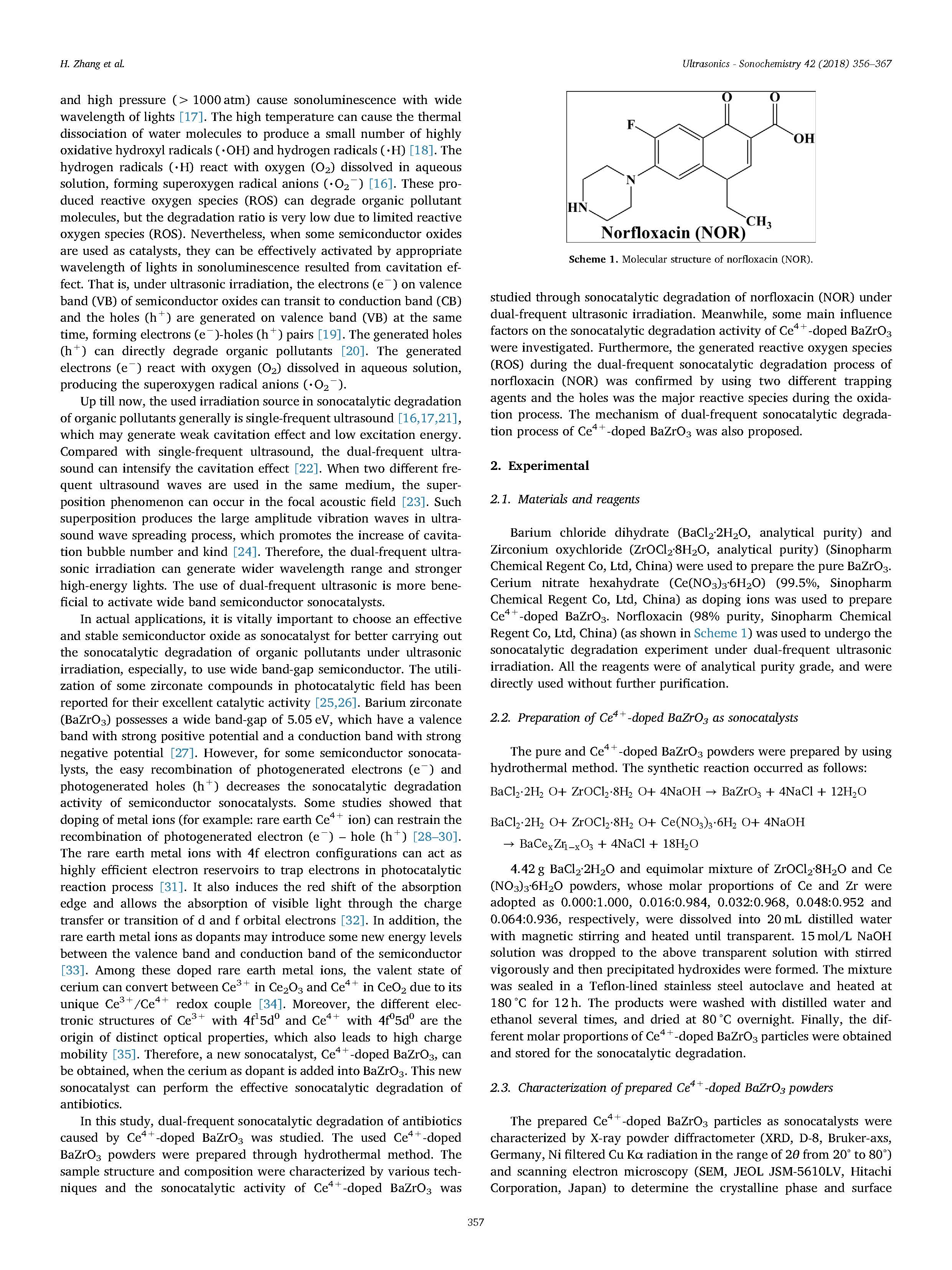 本文研究了Ce4摻雜BaZrO 3對(duì)抗生素諾氟沙星(NOR)的雙頻催化降解,采用水熱法制備了Ce4摻雜BaZrO 3作為一種高效、穩(wěn)定的新型聲催化劑。