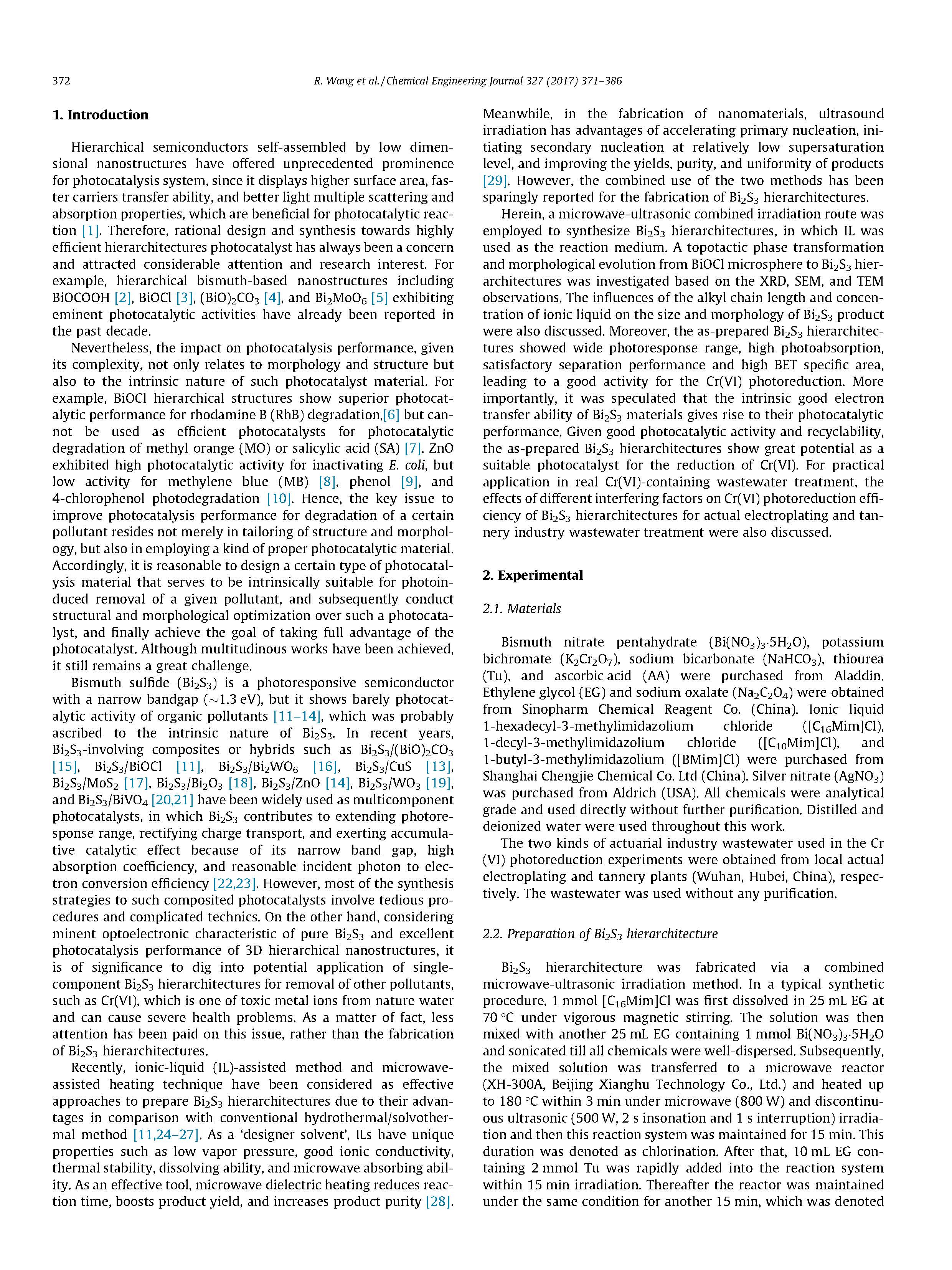 從生物陶瓷中轉(zhuǎn)化為乳酸的轉(zhuǎn)化提出了Bi2S3分層結(jié)構(gòu)的微球,發(fā)現(xiàn)結(jié)構(gòu)、尺寸和形態(tài)Bi2S3分級(jí)結(jié)構(gòu)可以通過(guò)改變氯化時(shí)間、烷基鏈長(zhǎng)和離子液體的濃度。此外,所制備的Bi2S3分層體系結(jié)構(gòu)顯示出眾可見光照射下Cr(VI)光還原到P25和不規(guī)則Bi2S3納米結(jié)構(gòu)的容量。形態(tài)、反應(yīng)體系pH值、Cr(VI)濃度和催化劑用量對(duì)Cr(VI)的影響還討論了Bi2S3分層結(jié)構(gòu)的減光能力。光還原能力的增強(qiáng)不僅歸因于Bi2S3的固有良好的電子轉(zhuǎn)移能力,而且還歸因于特殊結(jié)構(gòu)的協(xié)同作用、寬光響應(yīng)范圍、高光光吸附、高BET具有良好的表面面積和良好的電子空穴分離性能。