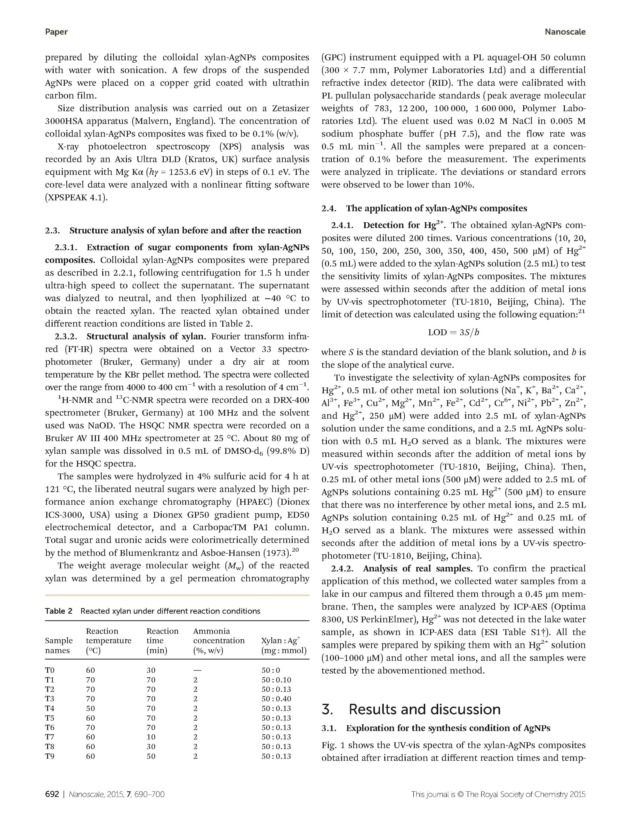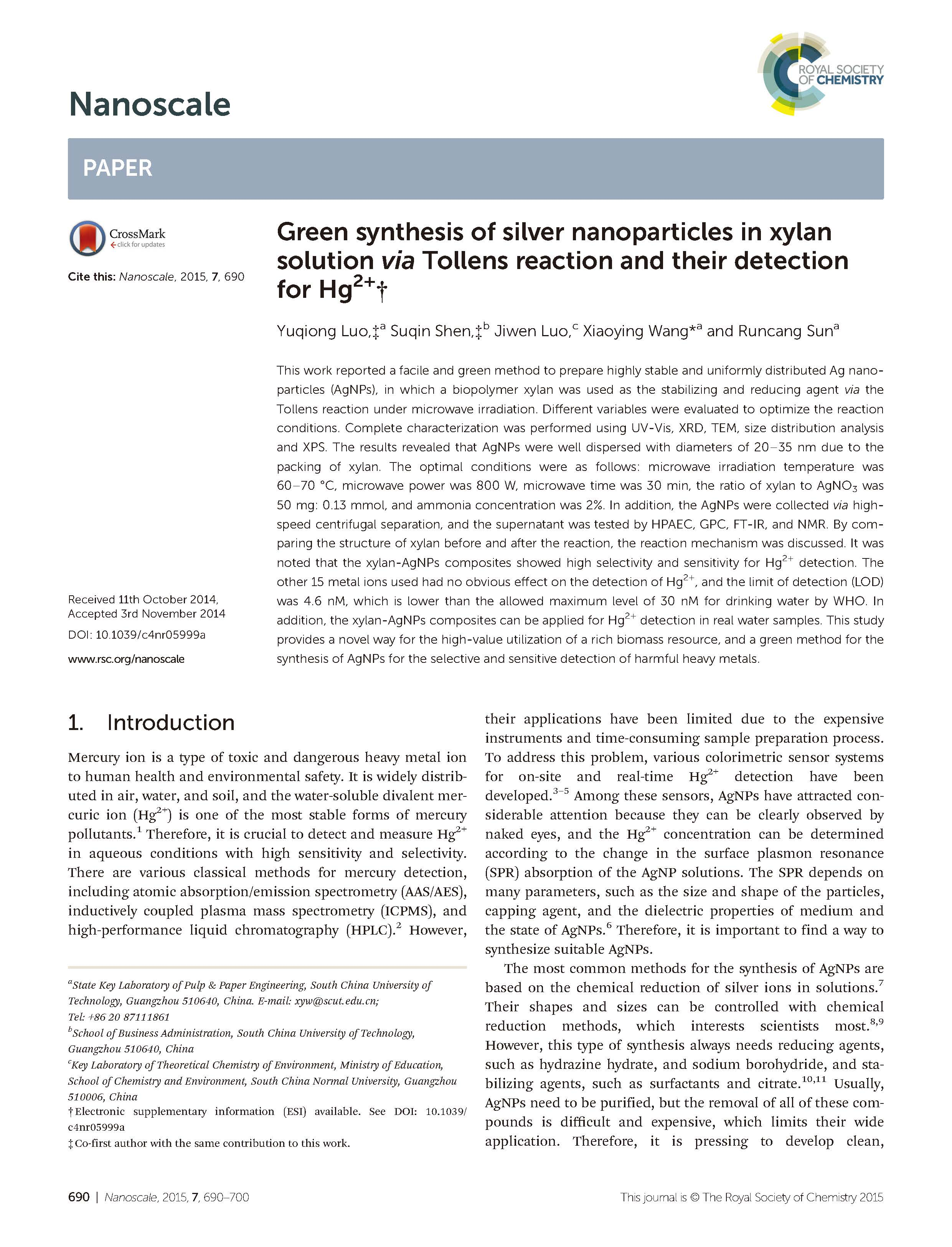 這篇由華南理工大學(xué)等的研究學(xué)者完成,討論通過Tollens反應(yīng)綠色合成木聚糖溶液中的銀納米粒子及其對Hg2 +的檢測的論文,發(fā)表在一區(qū)重要期刊《Nanoscale》,影響因子:7.233。
