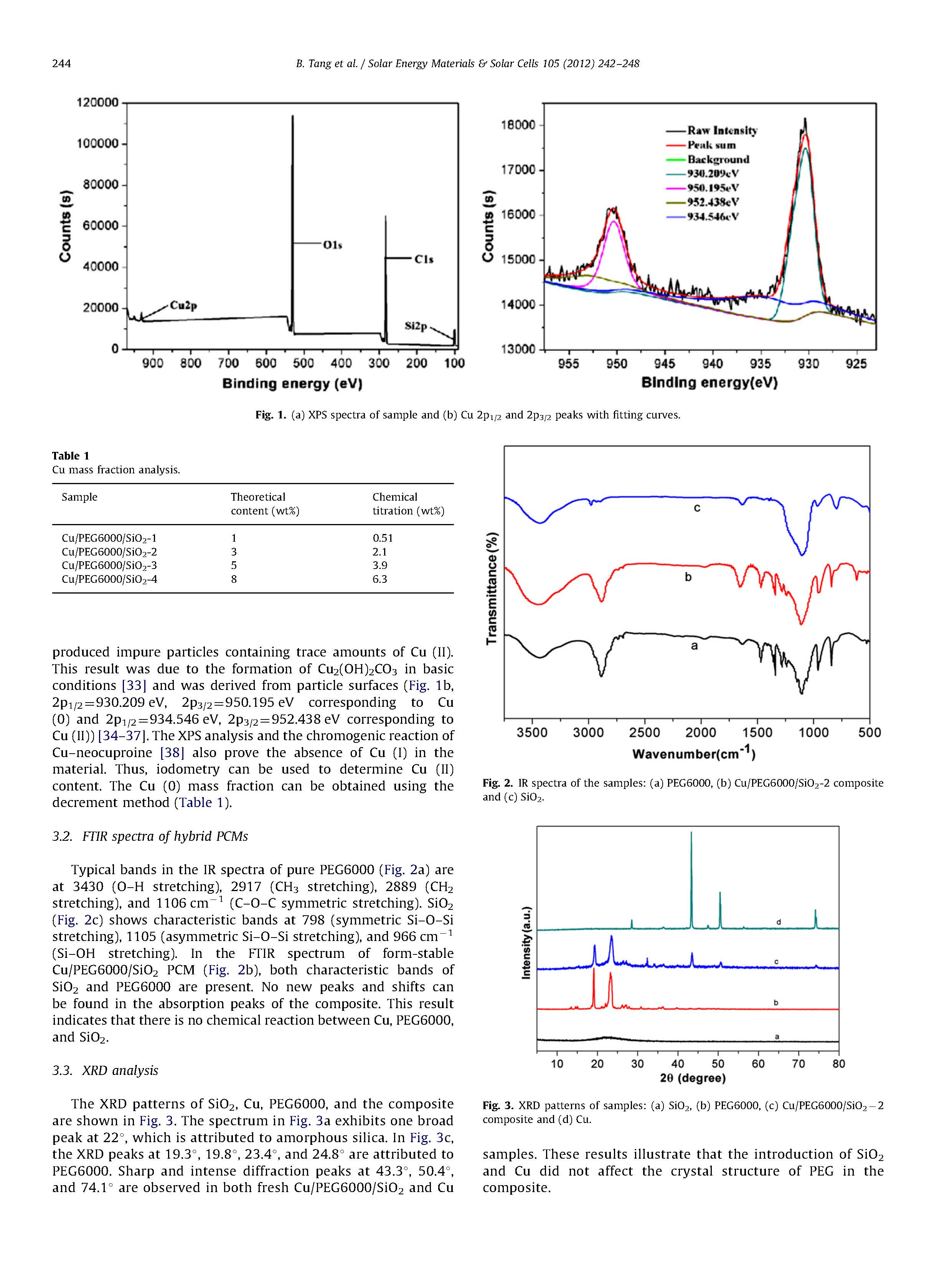 XPS結(jié)果表明,銅在PEG 6000/SiO 2 PCM中的價態(tài)主要為零。FTIR表明Cu、PEG 6000與SiO 2之間沒有新的化學鍵。通過差示掃描量熱法(DSC)和熱重分析(TGA)驗證了復合材料的熱性能和熱穩(wěn)定性。