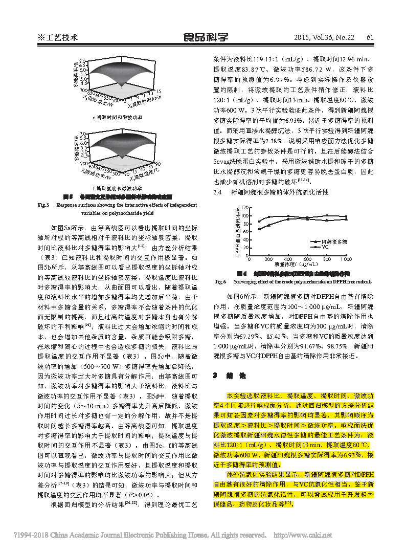 為了獲得微波提取新疆阿魏根多糖的最佳工藝,以及新疆阿魏粗多糖的體外抗氧化活性,采用響應(yīng)面法優(yōu)化新疆阿魏水溶性多糖的微波提取工藝,在單因素試驗(yàn)的基礎(chǔ)上選取液料比、提取溫度、提取時(shí)間、微波功率進(jìn)行試驗(yàn)設(shè)計(jì),以所得多糖質(zhì)量與苯酚硫酸法測(cè)得的多糖含量百分?jǐn)?shù)的乘積作為優(yōu)化指標(biāo),并檢測(cè)新疆阿魏根多糖體外清除1,1-二苯基-2-三硝基苯肼(1,1-diphenyl-2-picrylhydrazyl, DPPH)自由基的活性。結(jié)果:最優(yōu)工藝條件為液料比120∶1(mL/g)、提取時(shí)間13 min、提取溫度80 ℃、微波功率600 W,多糖實(shí)際得率為6.93%,接近于理論值。新疆阿魏根多糖對(duì)DPPH自由基有很好的清除作用,當(dāng)質(zhì)量濃度為1 000 μg/mL時(shí),新疆阿魏根多糖對(duì)DPPH自由基的清除率為91.67%,作用接近于VC的清除作用。