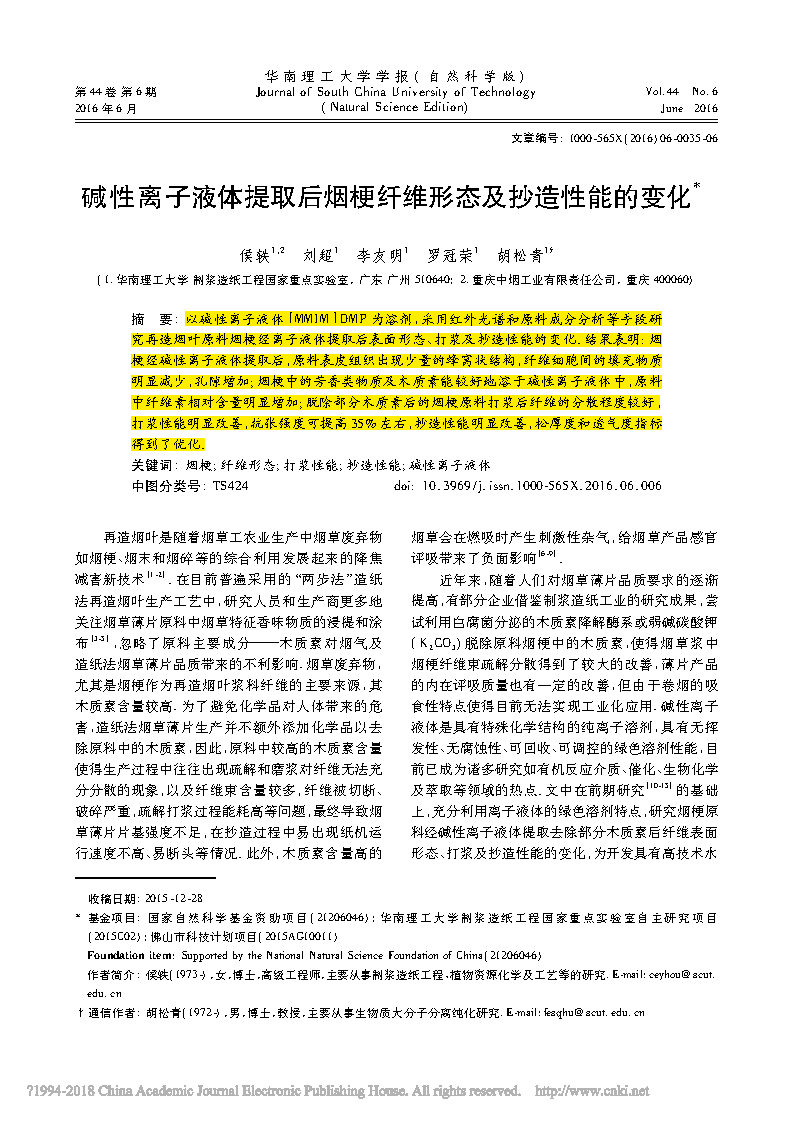 這篇由華南理工大學(xué)制漿造紙工程國(guó)家重點(diǎn)實(shí)驗(yàn)室的研究學(xué)者完成,討論堿性離子液體提取后煙梗纖維形態(tài)及抄造性能的變化的論文,發(fā)表在重要期刊《華南理工大學(xué)學(xué)報(bào)》上。