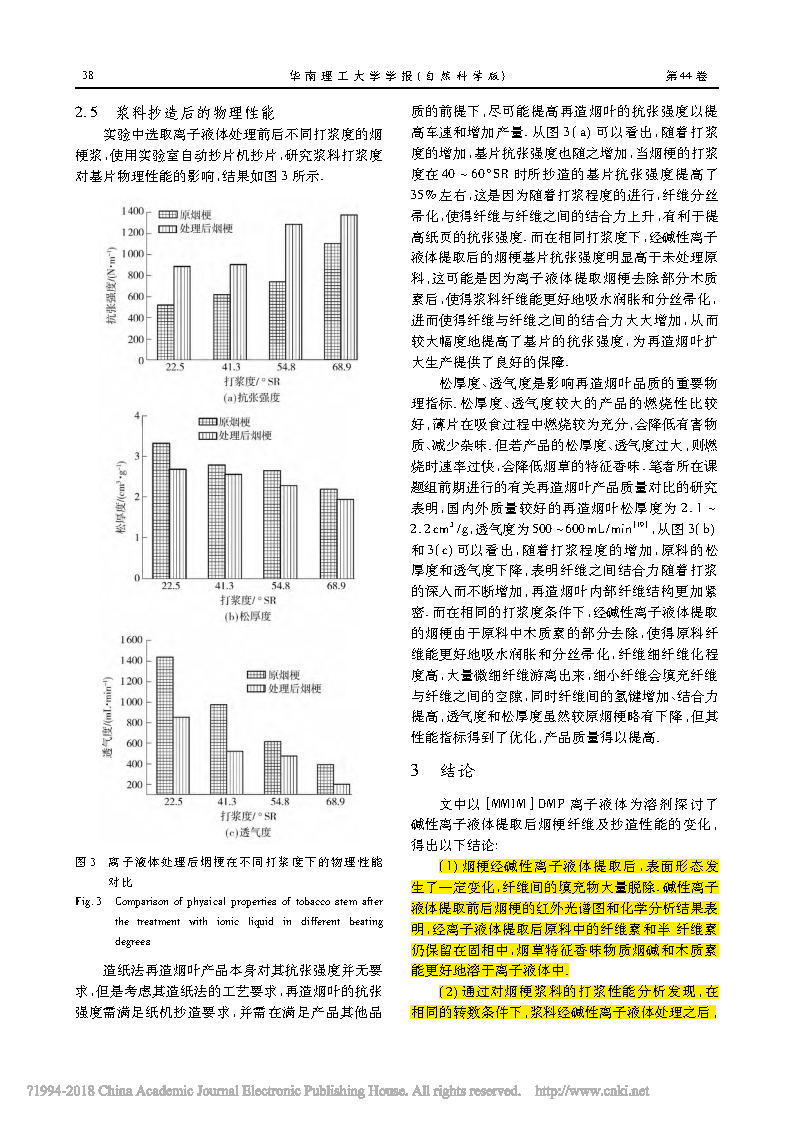 ( 1) 煙梗經(jīng)堿性離子液體提取后,表面形態(tài)發(fā)生了一定變化, 纖維間的填充物大量脫除.堿性離子液體提取前后煙梗的紅外光譜圖和化學(xué)分析結(jié)果表明,經(jīng)離子液體提取后原料中的纖維素和半纖維素仍保留在固相中, 煙草特征香味物質(zhì)煙堿和木質(zhì)素能更好地溶于離子液體中.( 2) 通過對(duì)煙梗漿料的打漿性能分析發(fā)現(xiàn),在相同的轉(zhuǎn)數(shù)條件下,漿料經(jīng)堿性離子液體處理之后,打漿度明顯增高,打漿性能明顯改善,節(jié)能降耗作用顯著.( 3) 經(jīng)離子液體處理過的煙梗漿基片的抗張強(qiáng)度明顯高于未經(jīng)處理原料, 抗張強(qiáng)度提高了 35% 左右,并且產(chǎn)品的松厚度、透氣度指標(biāo)得到了優(yōu)化, 為提高再造煙葉產(chǎn)品質(zhì)量提供了較好的技術(shù)支持.