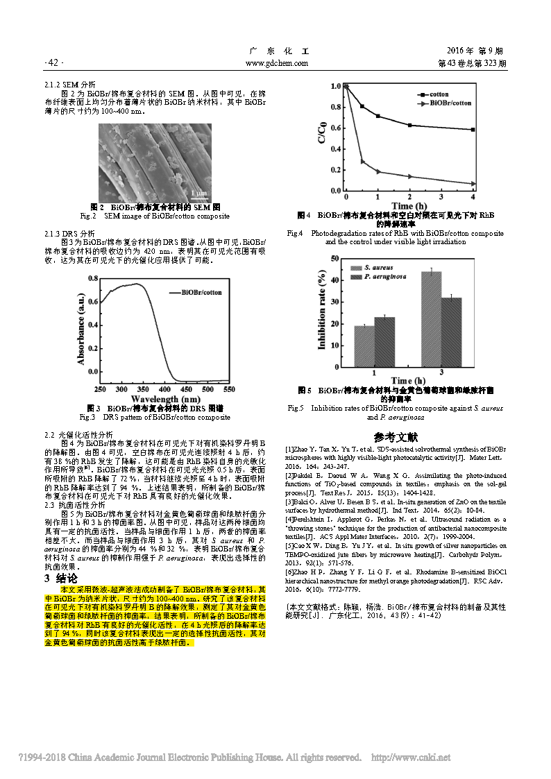 本文采用微波-超聲波法成功制備了BiOBr/棉布復(fù)合材料,其中BiOBr 為納米片狀,尺寸約為 100~400 nm。研究了該復(fù)合材料在可見光下對有機(jī)染料羅丹明 B 的降解效果,測定了其對金黃色葡萄球菌和綠膿桿菌的抑菌率,結(jié)果表明,所制備的 BiOBr/棉布復(fù)合材料對 RhB 有良好的光催化活性,在 4 h 光照后的降解率達(dá)到了 94 %,同時(shí)該復(fù)合材料表現(xiàn)出一定的選擇性抗菌活性,其對金黃色葡萄球菌的抗菌活性高于綠膿桿菌。