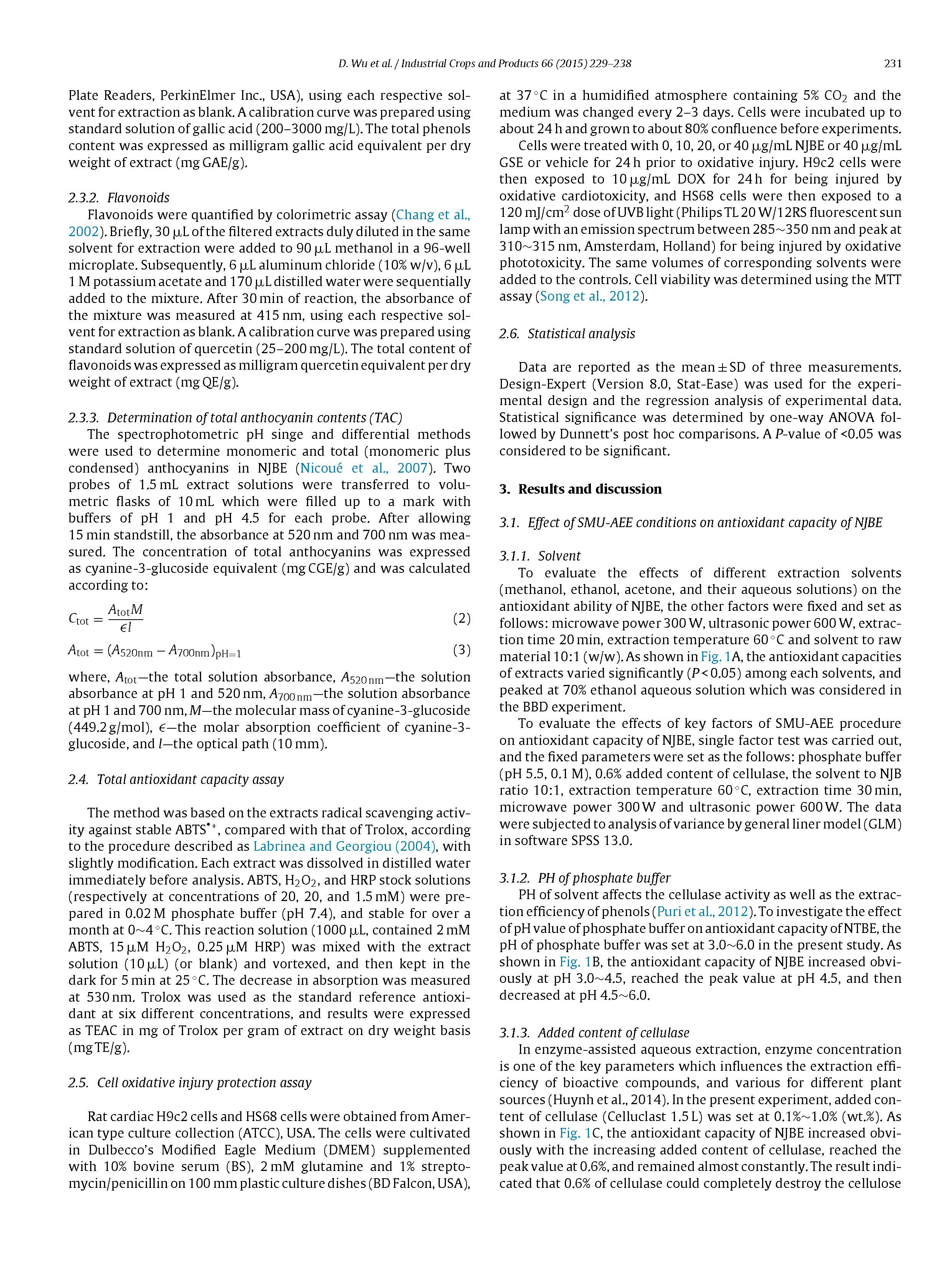 本研究首次建立了微波、超聲波和酶三種輔助提取技術(shù)相結(jié)合的SMU-AEE方法,用于從漿果汁副產(chǎn)物中提取抗氧化成分。通過單因素試驗和正交試驗,確定了NJB中抗氧化成分提取的實驗條件為:70%乙醇提取溶劑、0.6%纖維素酶添加量、磷酸鹽緩沖液pH 4.5、超聲功率800 W、微波功率420 W、溶劑與NJB比20:1、提取溫度66℃、提取時間43 min。NJBE的抗氧化能力為219.73±7.03 mg TE/g,比傳統(tǒng)提取方法提高27.62%~190.23%?;瘜W(xué)成分分析表明,與傳統(tǒng)提取方法相比,SMU-AEE法測定NJBE中酚類、黃酮類和花色苷的含量分別高25.06%~141.48%、8.86%~133.52和9.81%~92.42%。提示SMU-AEE提高NJBE的抗氧化能力是提高NJB抗氧化成分提取效率的結(jié)果。此外,NJBE在UVB-氧化光毒性和阿霉素-氧化心臟毒性中具有良好的細(xì)胞保護(hù)作用,表明其在食品和制藥工業(yè)中具有很好的天然抗氧化作用。