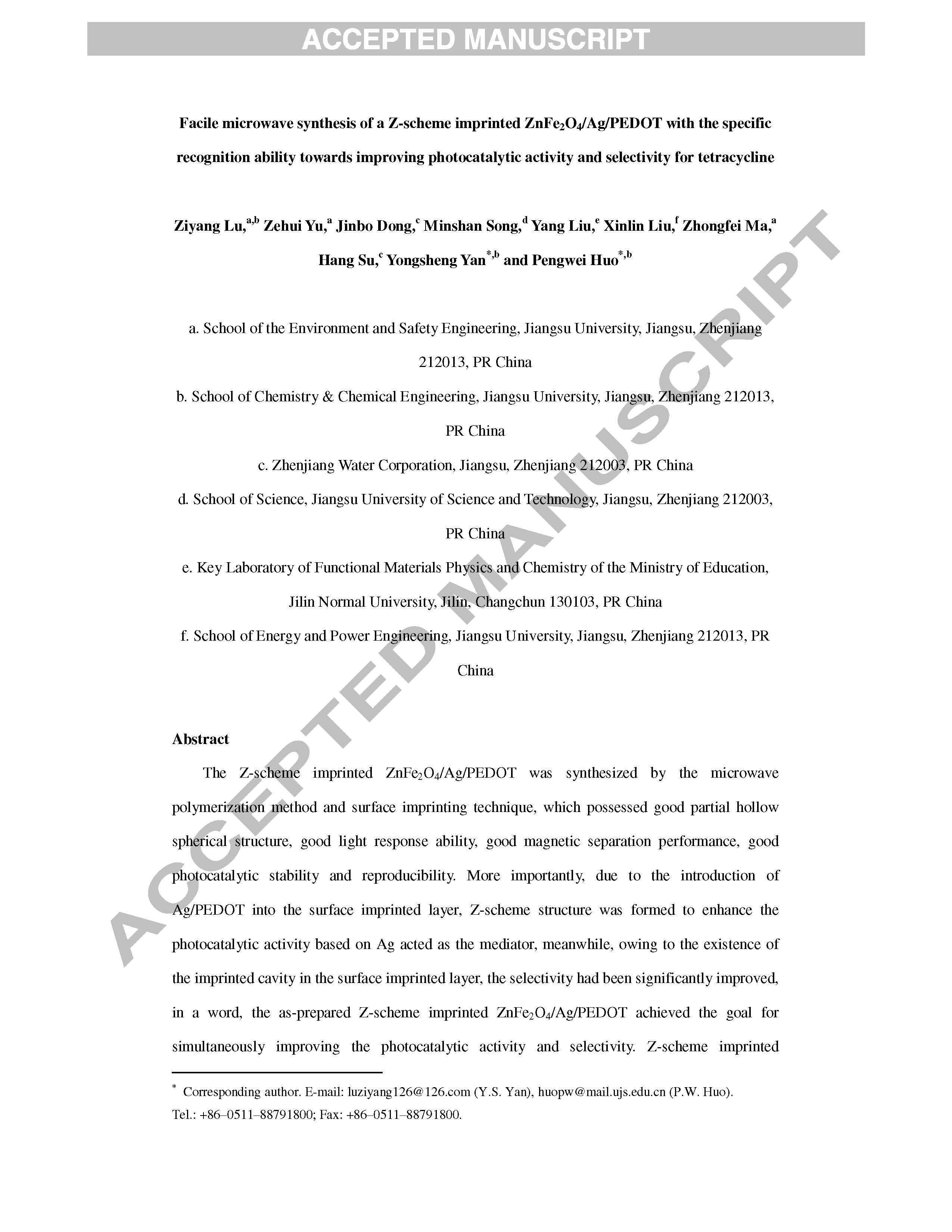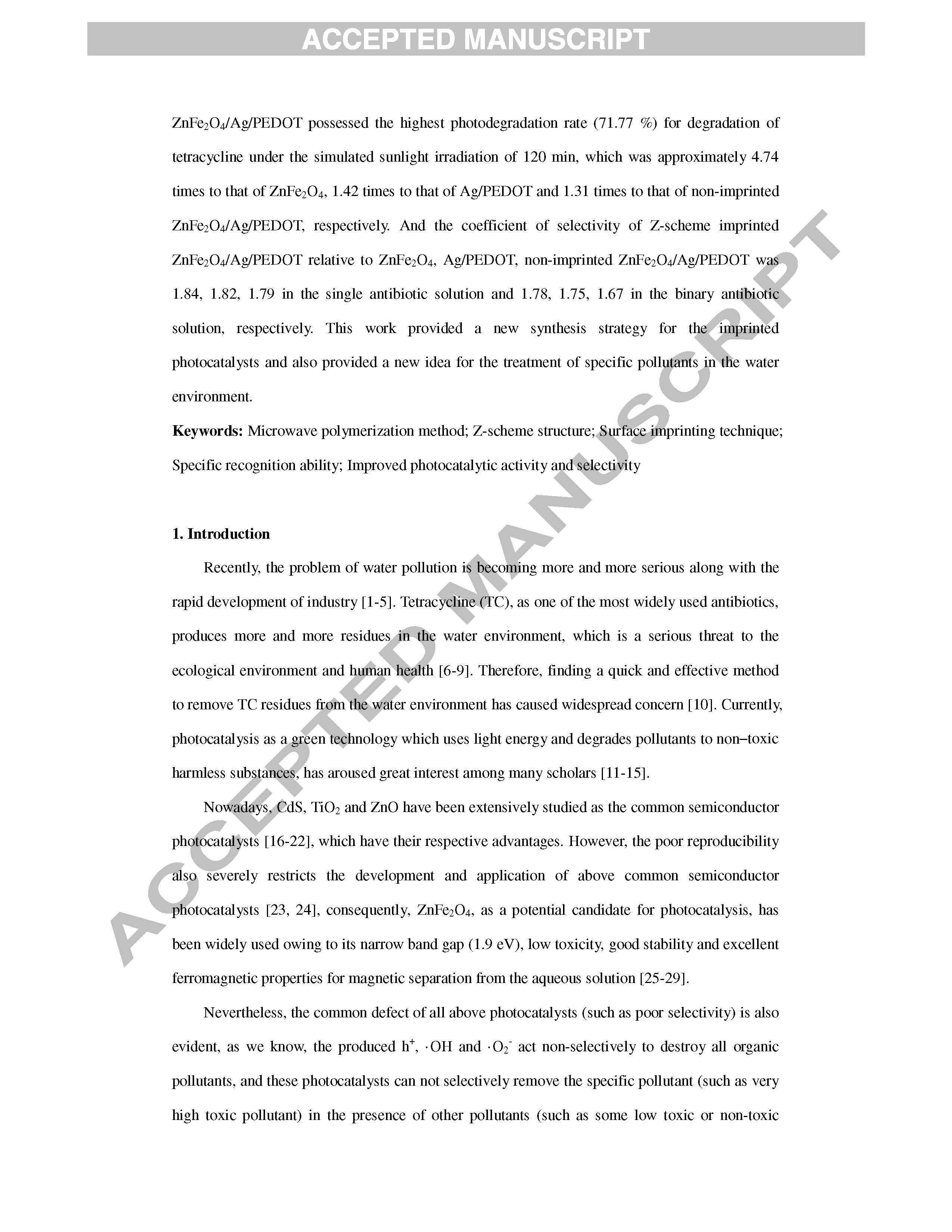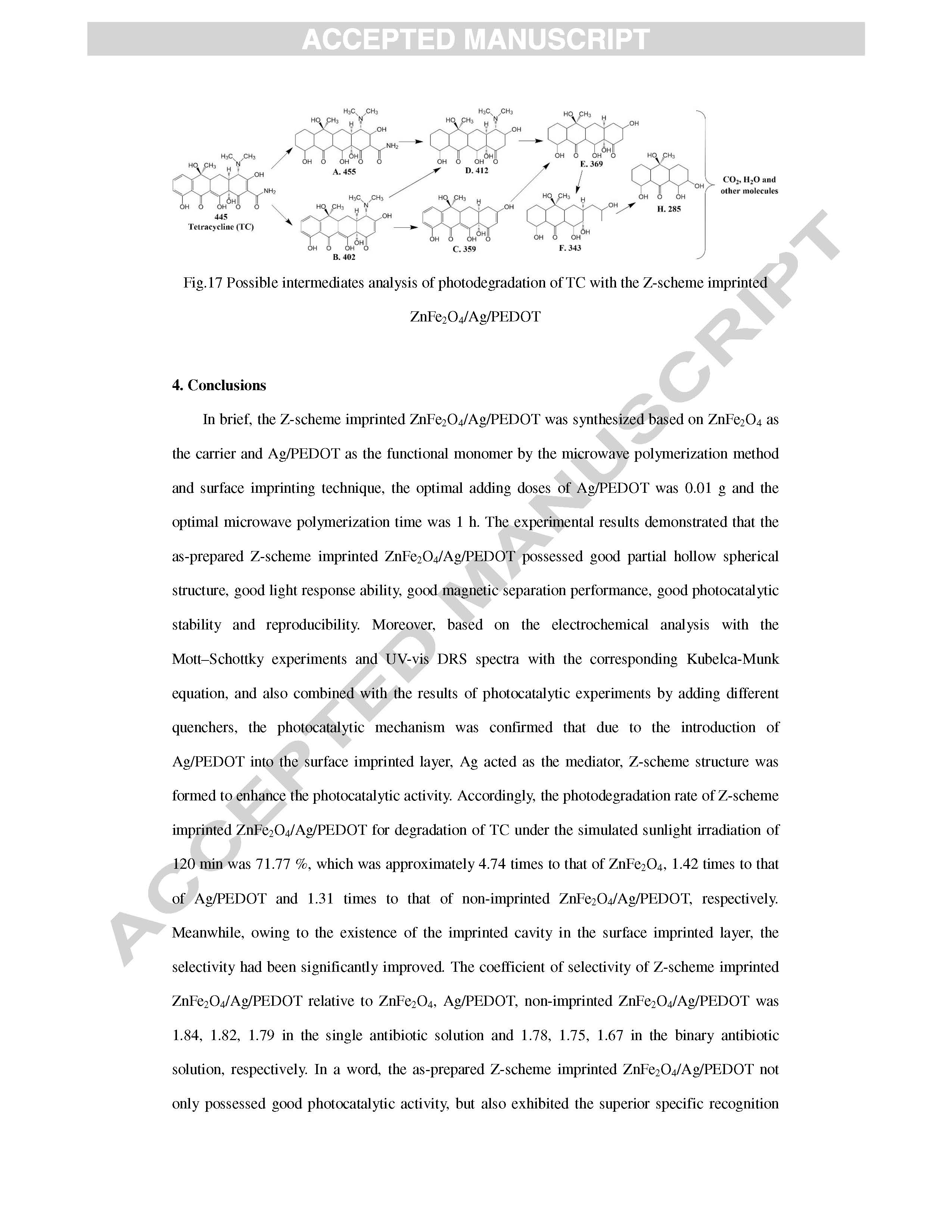 241 簡易微波合成Z-方案印跡ZnFe2O4 / Ag / PEDOT具有提高四環(huán)素光催化活性和選擇性的特異識別能力