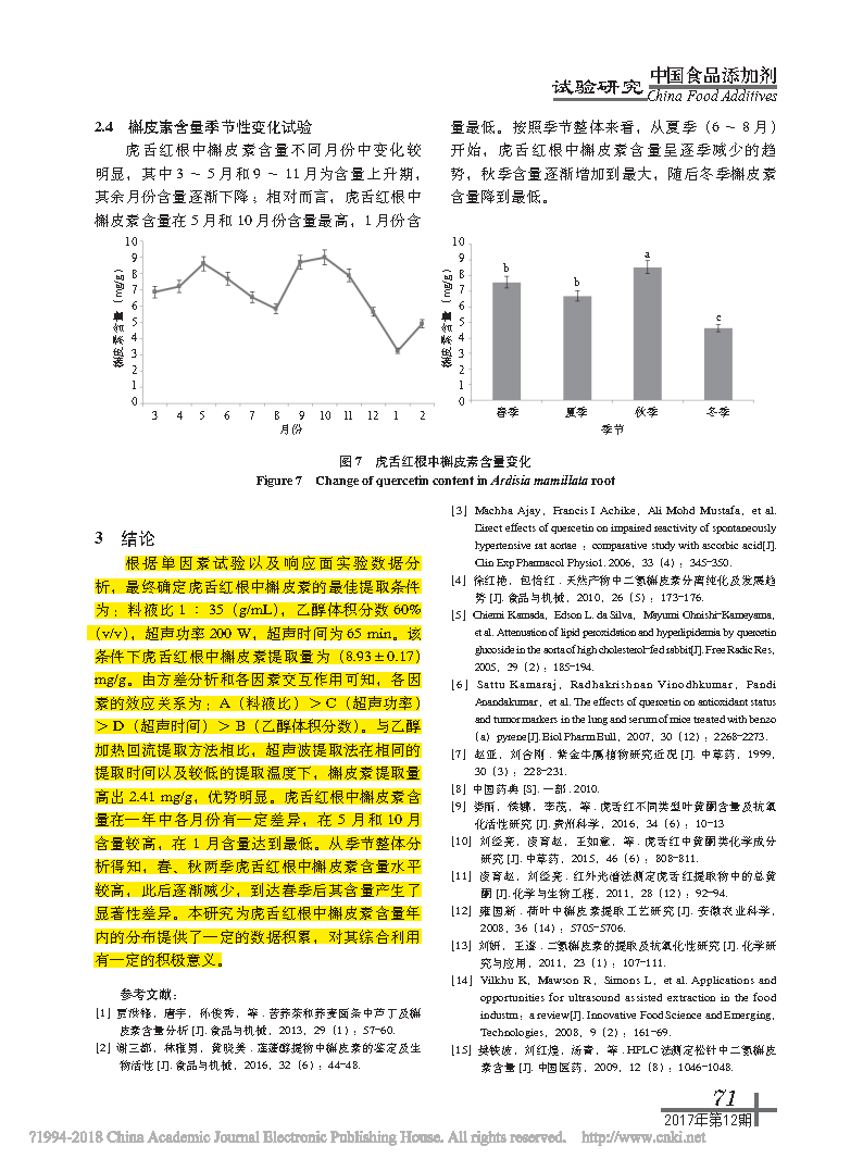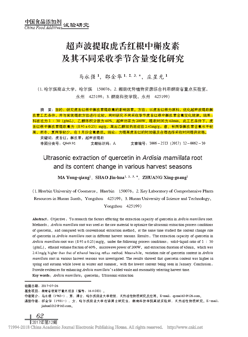 這篇由哈爾濱商業(yè)大學(xué)的研究學(xué)者完成,討論超聲波提取虎舌紅根中槲皮素及其不同采收季節(jié)含量變化研究的論文,發(fā)表在重要期刊《中國食品添加劑》上。