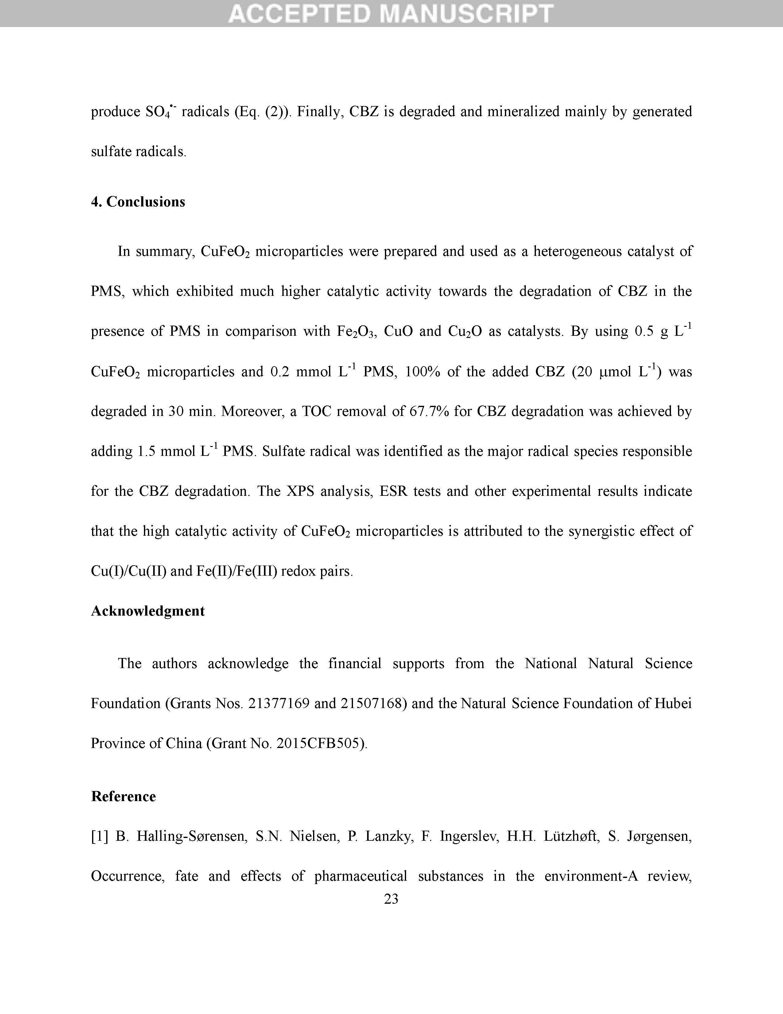 總之,制備了CuFeO 2微粒,并將其作為PMS的多相催化劑,與Fe2O3、CuO和Cu2O作為催化劑相比,PMS對CBZ的降解具有更高的催化活性。采用0.5g L-1 CuFeO 2微粒和0.2mmol L-1 PMS,在30 min內對添加的CBZ(20mmol L-1)進行了100%的降解。加入1.5mmol L-1的PMS后,CBZ的TOC去除率可達67.7%.硫酸根是引起CBZ降解的主要自由基。XPS分析、ESR測試等實驗結果表明,Cu(I)/Cu(II)和Fe(II)/Fe(III)氧化還原對的協(xié)同作用是CuFeO 2微粒催化活性高的原因。