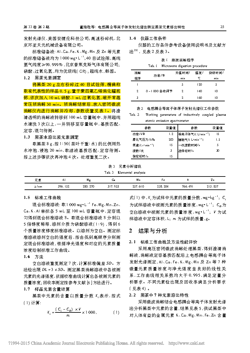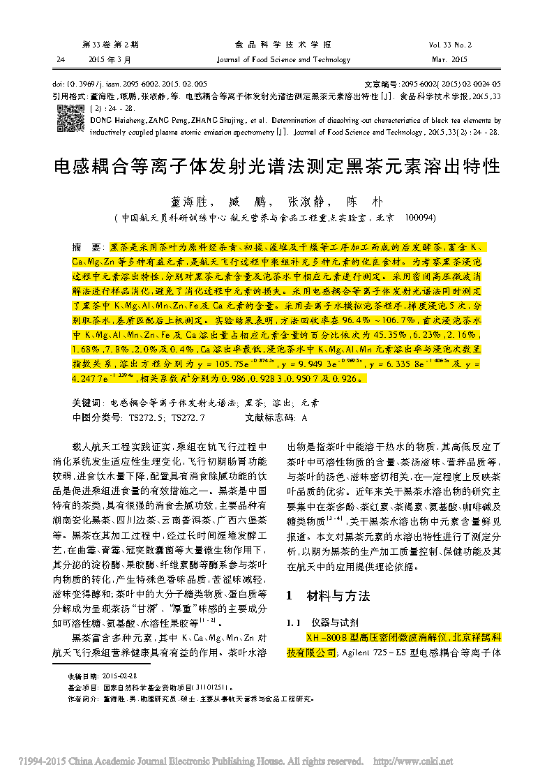 黑茶是采用茶葉為原料經(jīng)殺青、初揉、渥堆及干燥等工序加工而成的后發(fā)酵茶,富含K、 Ca、Mg、Zn 等多種有益元素,是航天飛行過(guò)程中乘組補(bǔ)充多種元素的優(yōu)良食材。為考察黑茶浸泡過(guò)程中元素溶出特性,分別對(duì)黑茶元素含量及泡茶水中相應(yīng)元素進(jìn)行測(cè)定。采用密閉高壓微波消解法進(jìn)行樣品消化,避免了消化過(guò)程中元素的損失。采用電感耦合等離子體發(fā)射光譜法同時(shí)測(cè)定了黑茶中 K、Mg、Al、Mn、Zn、Fe 及 Ca 元素的含量。采用去離子水模擬泡茶程序,梯度浸泡 5 次,分別取茶水,基質(zhì)匹配后上機(jī)測(cè)定。實(shí)驗(yàn)結(jié)果表明,方法回收率在 96. 4% ~ 106. 7% ,首次浸泡茶水中 K、Mg、Al、Mn、Zn、Fe 及 Ca 溶出量占相應(yīng)元素含量的百分比依次為 45. 35% ,6. 23%,2. 16%,1. 68%,7. 8%,2. 0% 及 0. 4%,Ca溶出率最低,浸泡茶水中 K、Mg、Al、Mn 元素溶出率與浸泡次數(shù)呈指數(shù)關(guān)系,溶出方程分別為y = 105. 75e-0. 874 3x,y = 9. 949 3e-0. 969 5x,y = 6. 335 8e-1. 406 5x 及y = 4. 247 7e-1. 339 4x,相關(guān)系數(shù)R2分別為0. 986,0. 928 3,0. 950 7及0. 926。