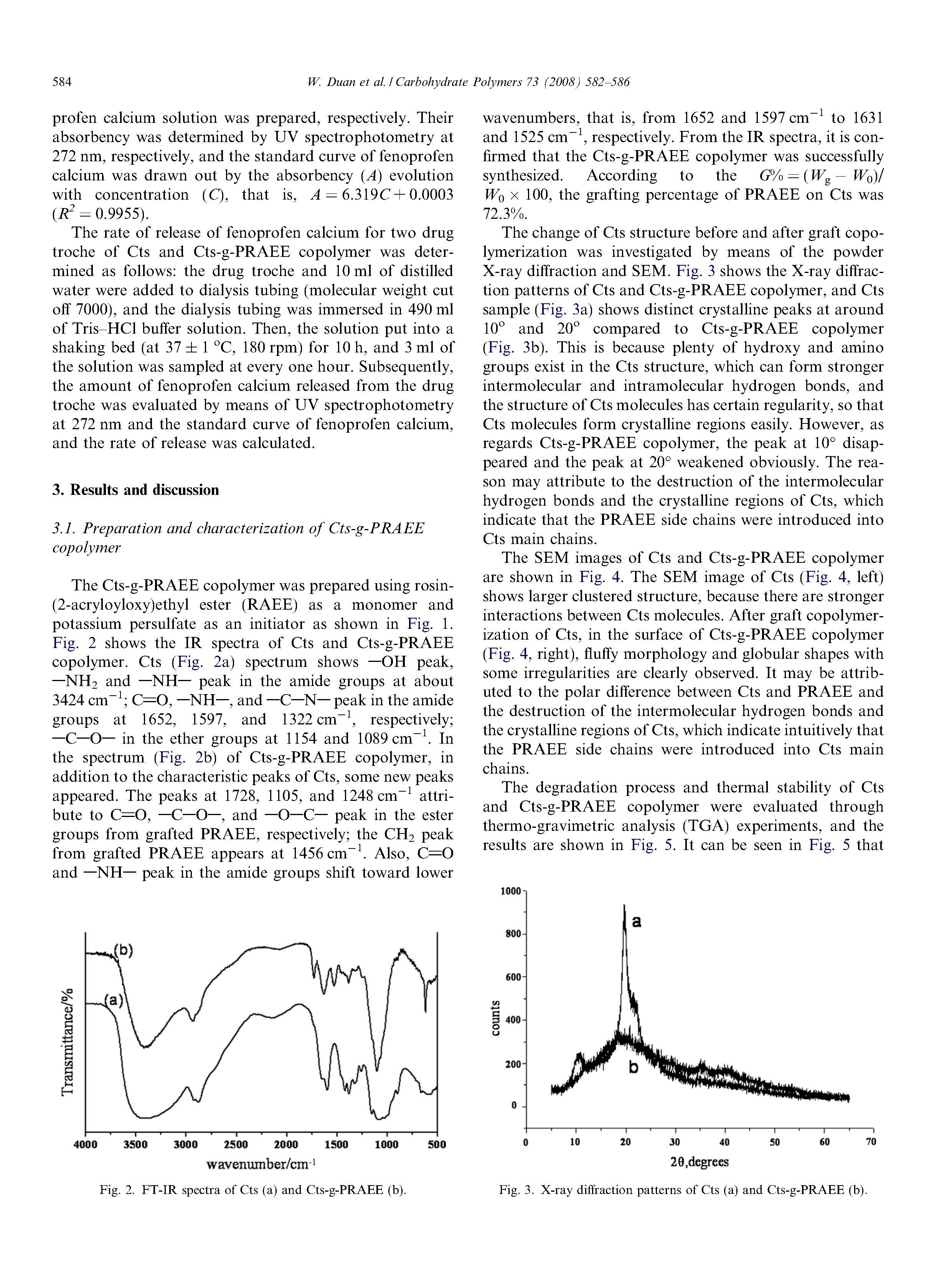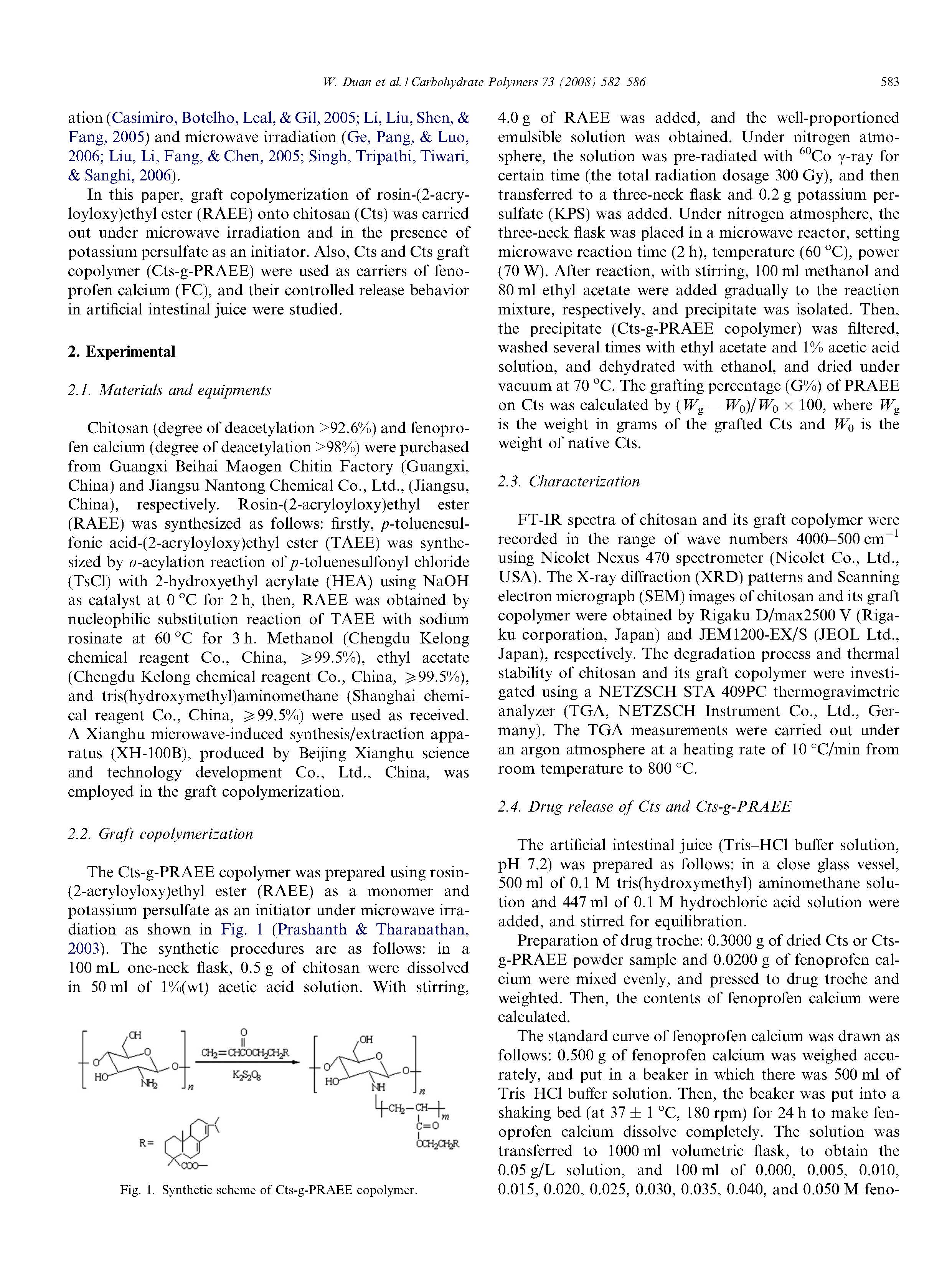 通過移植物制備CTS-G-PRAEE共聚物,松香-(2-丙烯酸酯氧基)乙酯共聚微波輻射下殼聚糖(CTS)的研究和使用過硫酸鉀作為引發(fā)劑。CTS和CTS-G-PRAEE共聚物的特征在于:FT-IR、XRD、SEM和TG證實了將RAEE單體接枝到CTS鏈上,在CTS上接枝率為72.3%。此外,通過透析方法測定非諾洛芬鈣對CTS和CTS-GPARAEE共聚物的釋放速率對人工腸液進行了對照研究非諾洛芬鈣的控釋CTS-G-PRAEE共聚物優(yōu)于CTS。