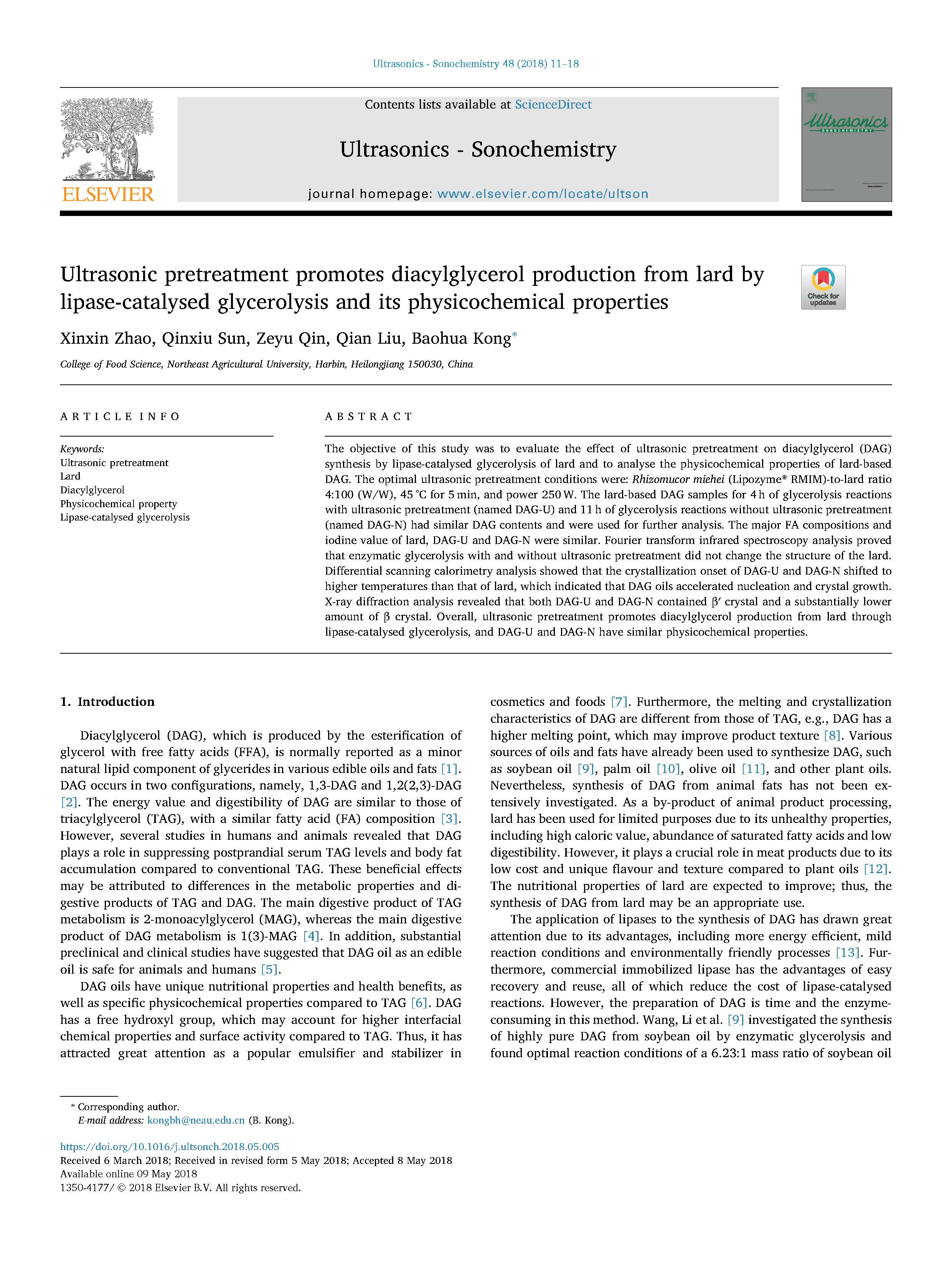 這篇由東北農(nóng)業(yè)大學(xué)等的研究學(xué)者完成,討論超聲預(yù)處理通過脂肪酶催化的甘油解及其物理化學(xué)特性促進(jìn)豬油中二?;视偷漠a(chǎn)生的論文,發(fā)表在二區(qū)重要期刊《Ultrasonics Sonochemistry》,影響因子:6.012。