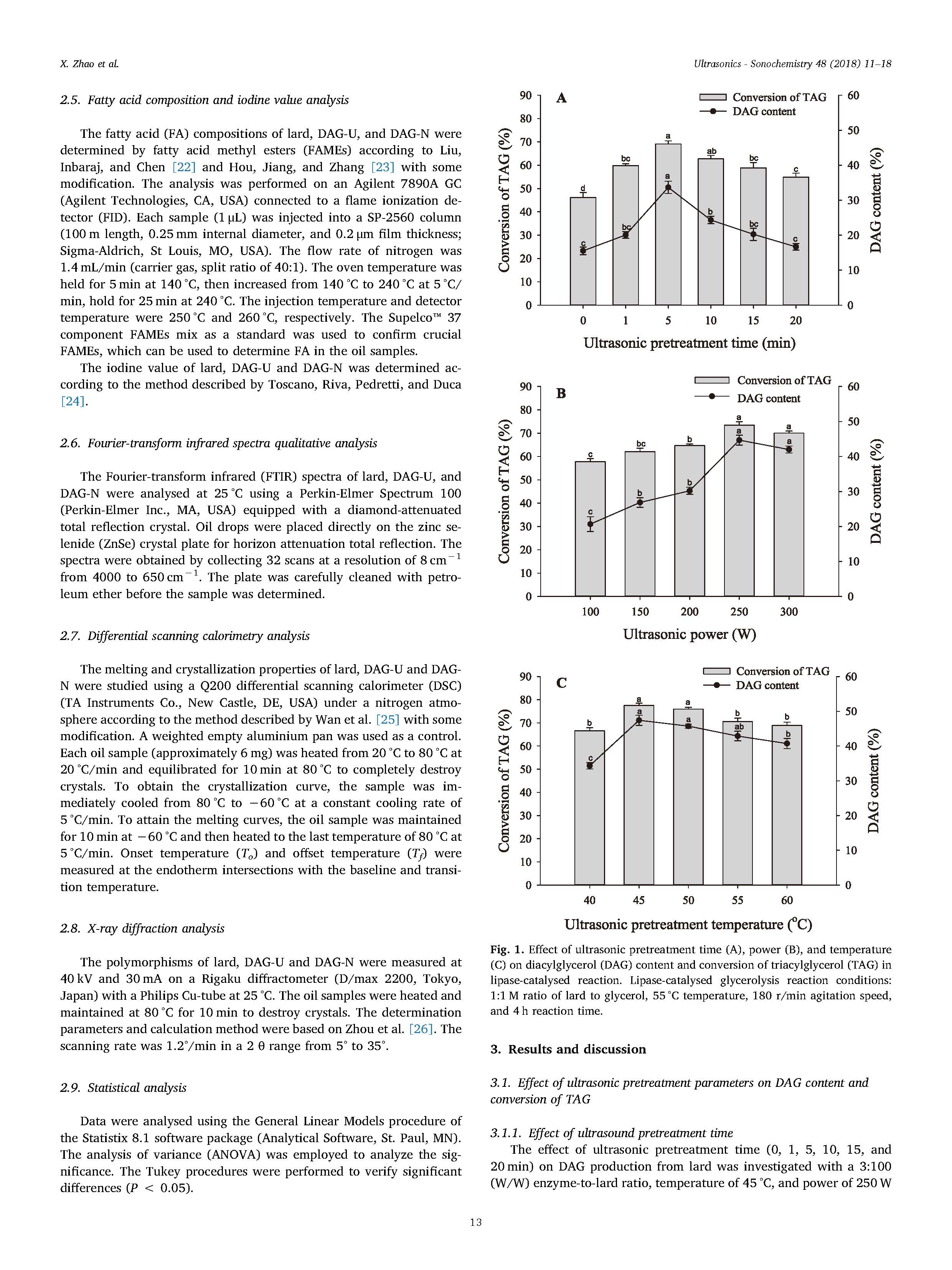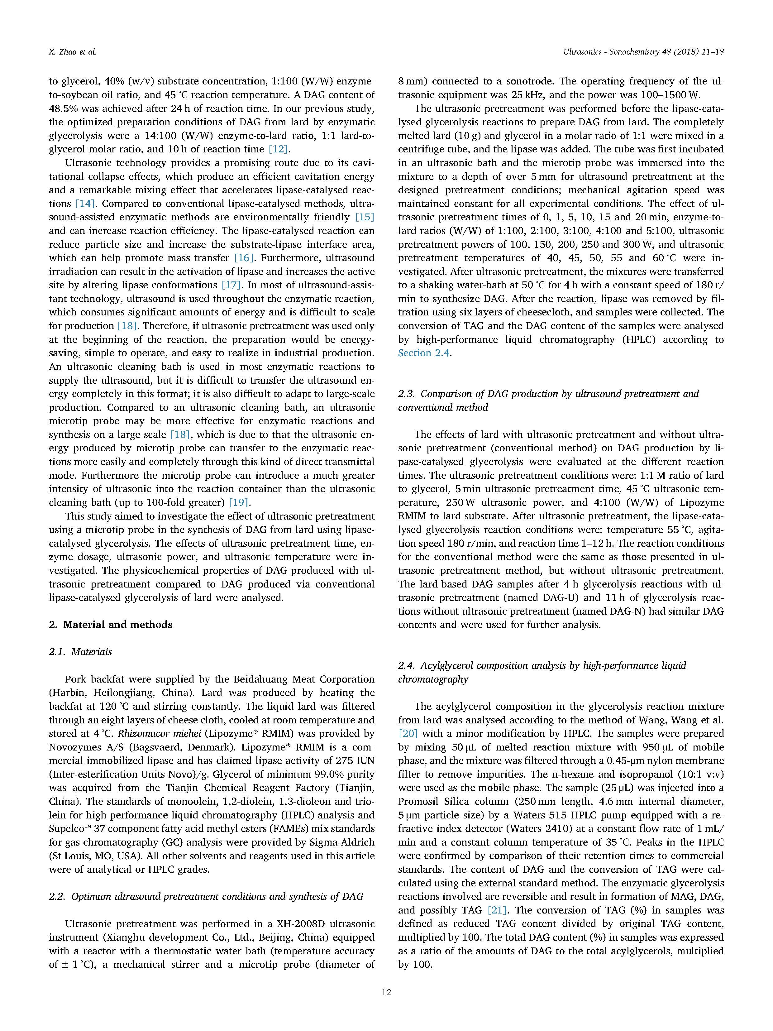 201 超聲預(yù)處理通過脂肪酶催化的甘油解及其物理化學(xué)特性促進(jìn)豬油中二?;视偷漠a(chǎn)生