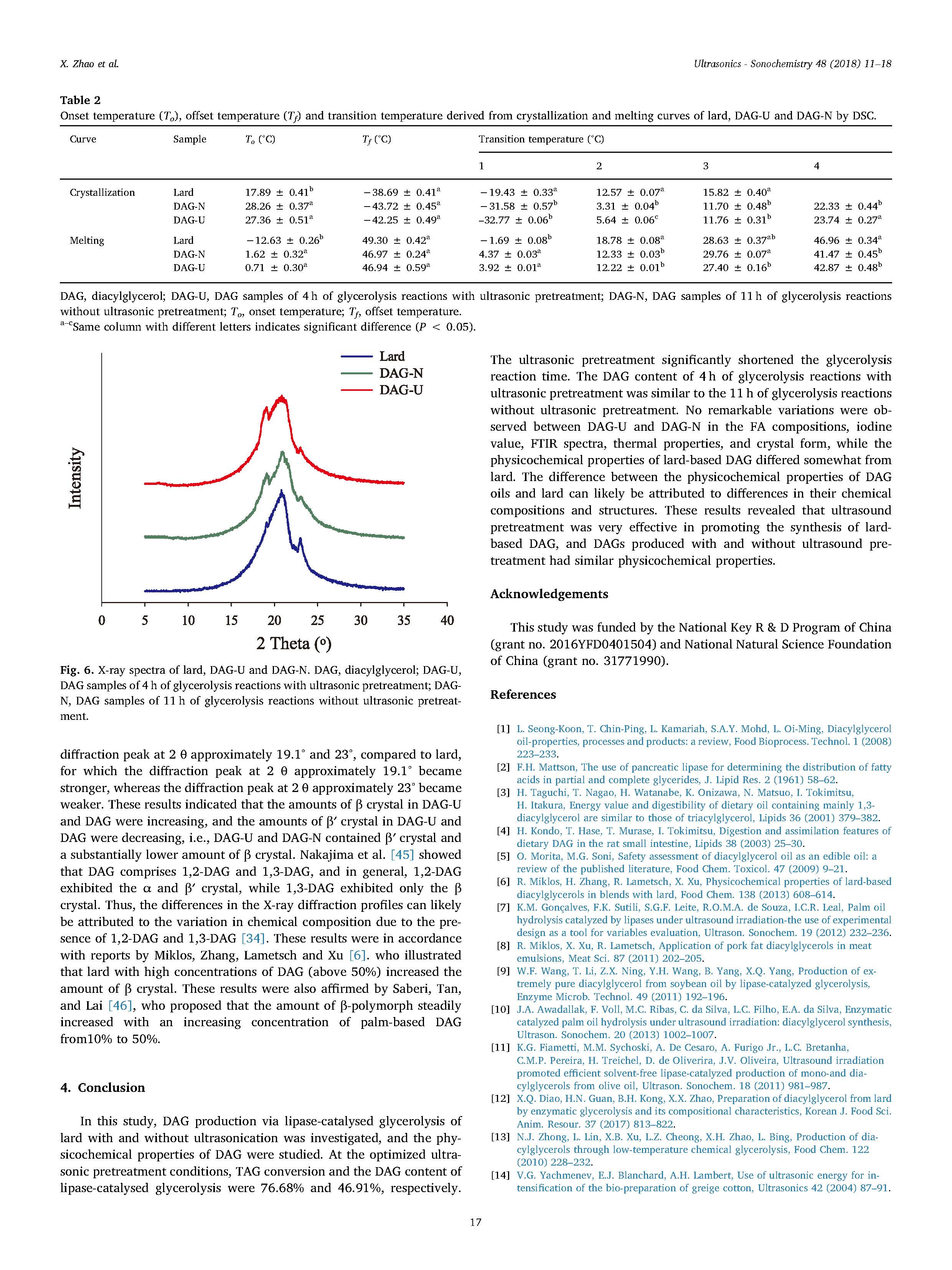 X射線衍射分析表明,DAG-U和DAG-N都含有“晶體”并且“基本較低”。超聲預(yù)處理促進(jìn)豬油中甘油二酯的生產(chǎn)脂肪酶催化甘油裂解和DAG-U和DAG-N具有相似的物理化學(xué)性質(zhì)。