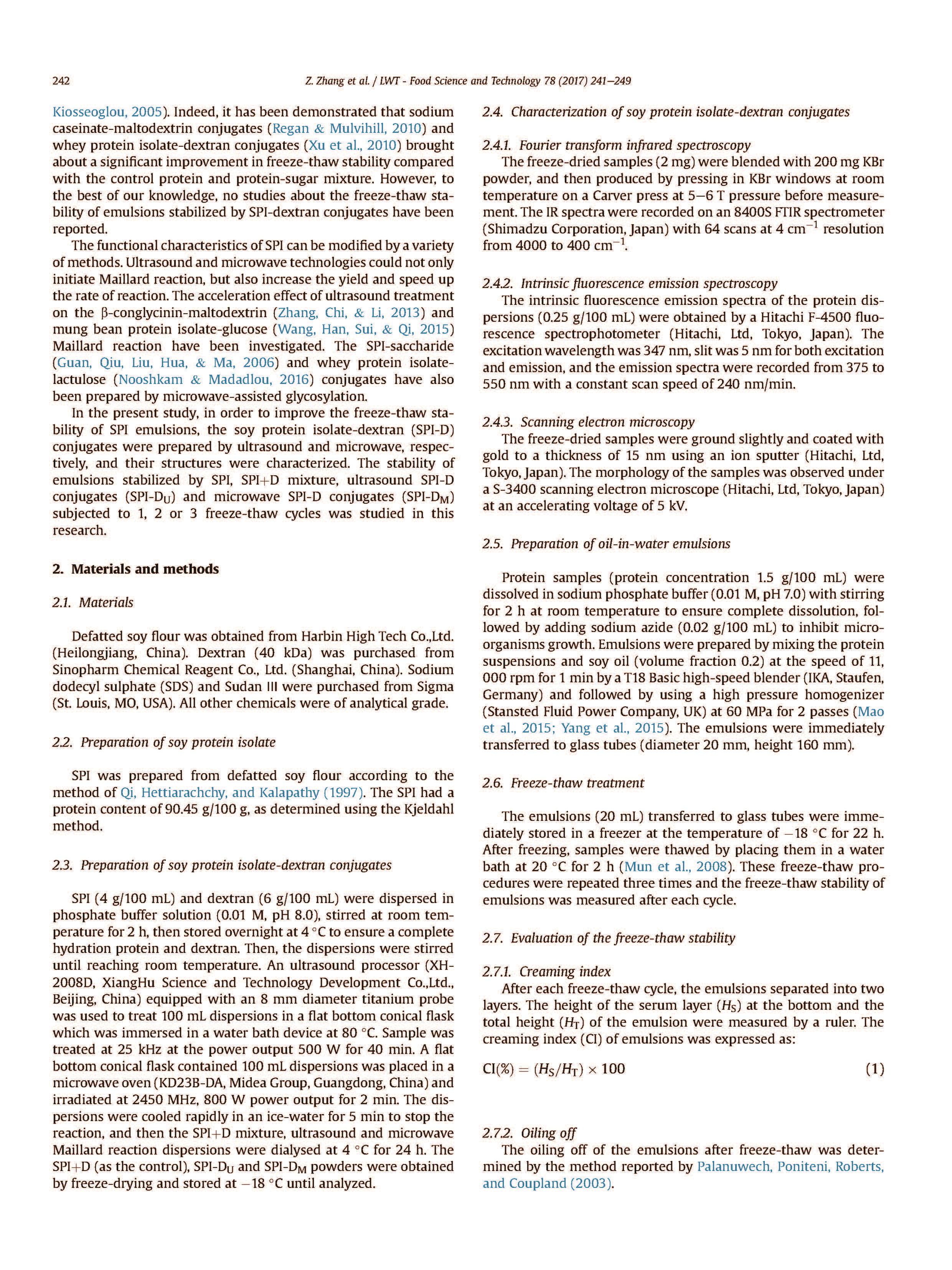 通過超聲(功率輸出500W)制備大豆蛋白分離-葡聚糖(SPI-D)綴合物,40分鐘)和微波(功率輸出800W用于2分鐘)輔助糖基化以改善大豆蛋白分離穩(wěn)定的油包水(O/W)乳液的冷凍穩(wěn)定性。傅里葉變換紅外和熒光發(fā)射光譜分析證實了形成共價鍵,通過Maillard反應(yīng)分離大豆蛋白分離物(SPI)和葡聚糖分子。