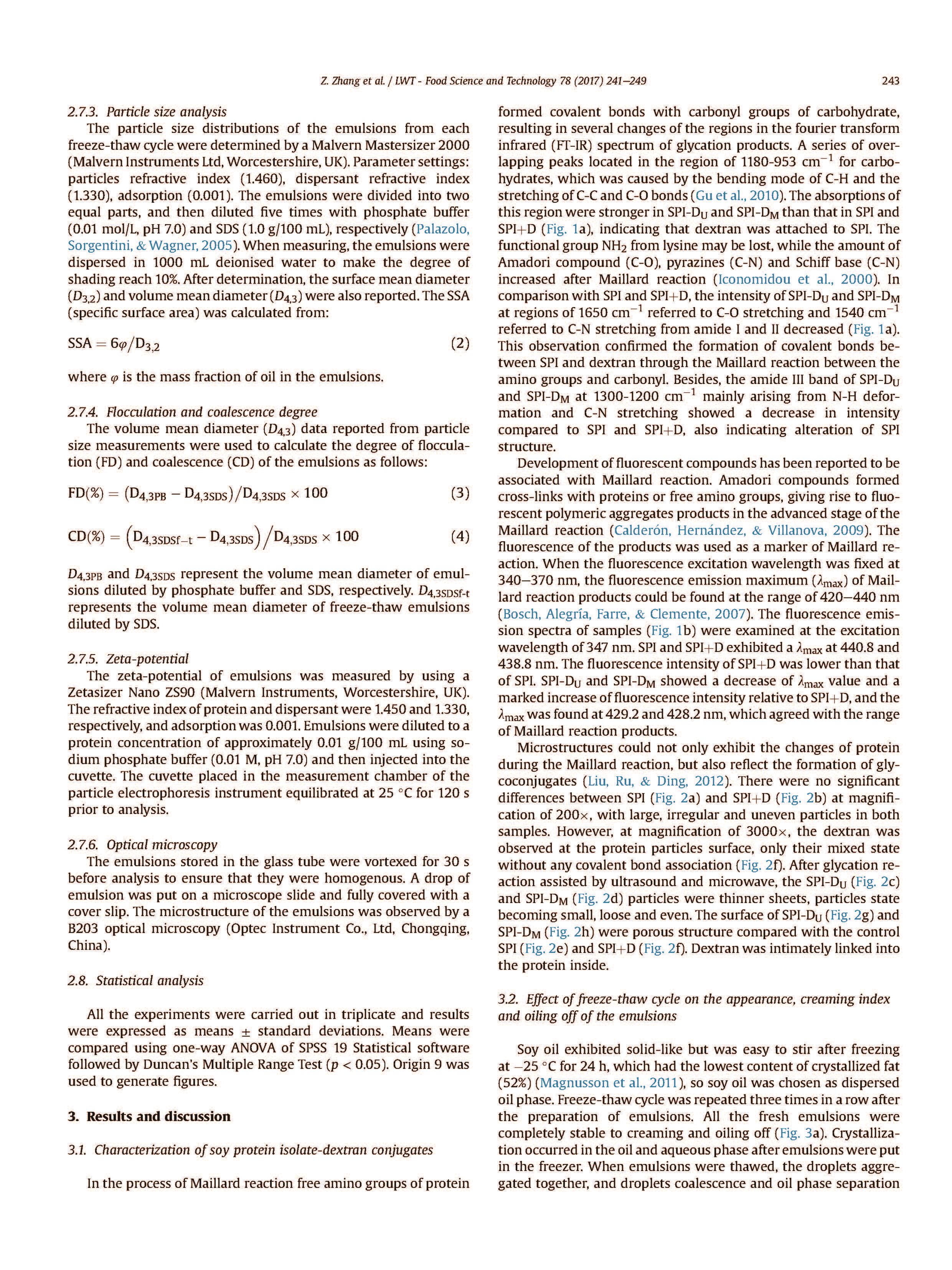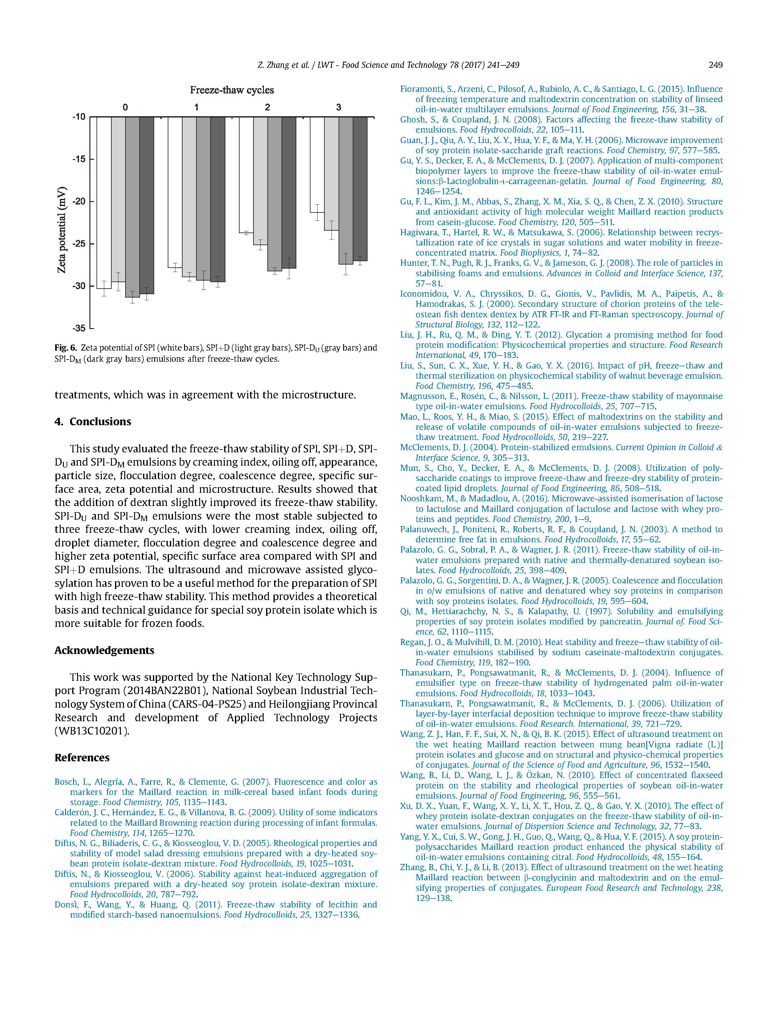 本研究從乳化指數(shù)、油化度、外觀、粒徑、絮凝度、聚結(jié)度、比表面積、Zeta電位和微結(jié)構(gòu)等方面評價了SPI、SPI D、SPIDU和SPI-DM乳劑的凍融穩(wěn)定性。結(jié)果表明,右旋糖酐的加入稍微提高了其凍融穩(wěn)定性。與SPI和SPI D乳液相比,SPI-DU和SPI-DM乳劑在三次凍融循環(huán)下最穩(wěn)定,與SPI和SPI D乳液相比,乳狀液具有較低的乳狀液指數(shù)、油化度、液滴直徑、絮凝度和聚結(jié)度以及較高的Zeta電位和比表面積。超聲和微波輔助糖基化是制備高凍融穩(wěn)定性SPI的有效方法。該方法為更適用于冷凍食品的大豆分離蛋白提供了理論依據(jù)和技術(shù)指導(dǎo)。