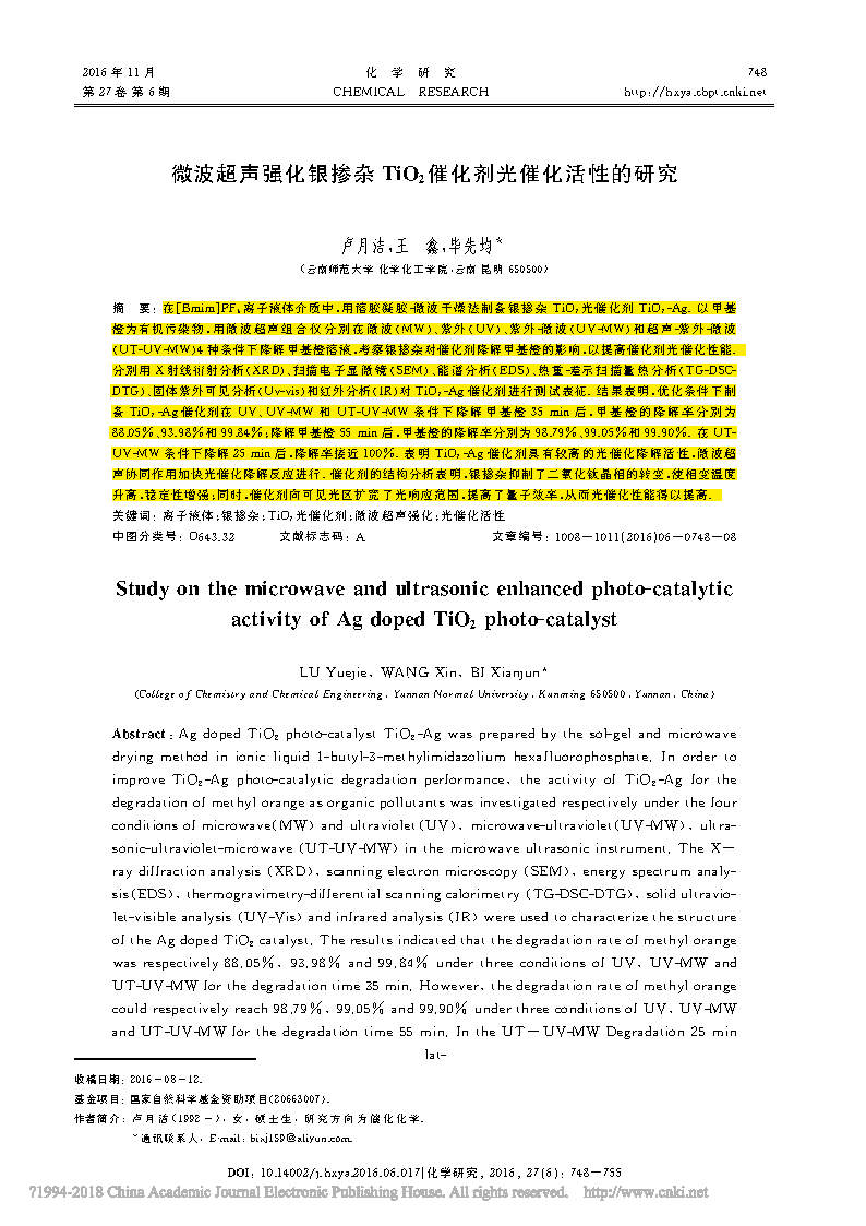 在[Bmim]PF6離子液體介質(zhì)中,用 溶膠凝膠-微 波 干 燥 法 制 備 銀 摻 雜 TiO2光 催化劑 TiO2-Ag.以 甲基 橙為有機(jī)污染物,用 微 波 超 聲 組 合 儀 分 別 在 微 波(MW)、紫 外(UV)、紫 外-微 波(UV-MW)和超 聲-紫 外-微 波 (UT-UV-MW)4種條件下降解甲基橙溶液,考察銀摻雜對(duì)催化劑降解甲基橙的影響,以提高催化劑光催化性能. 分別用 X射線衍射分析(XRD)、掃 描 電 子 顯 微 鏡(SEM)、能 譜分析(EDS)、熱 重-差 示 掃 描 量 熱 分 析(TG-DSC- DTG)、固體紫外可見(jiàn)分析(Uv-vis)和紅外分析(IR)對(duì) TiO2-Ag催化劑進(jìn)行測(cè)試表征.結(jié)果表明,優(yōu)化條件下制 備 TiO2-Ag催化劑在 UV、UV-MW 和 UT-UV-MW 條 件 下 降 解 甲 基 橙 35 min后,甲 基 橙 的 降 解 率 分 別 為 88.05%、93.98%和99.84%;降解甲基橙55min后,甲基橙的降解率分別為98.79%、99.05%和99.90%.在 UT- UV-MW 條件下降解25min后,降解率接近100%.表 明 TiO2-Ag催 化 劑 具 有 較 高 的 光 催 化 降 解 活 性,微 波超 聲協(xié)同作用加快光催化降解反應(yīng)進(jìn)行.催化劑的結(jié)構(gòu)分析表明,銀摻雜抑制了二氧化鈦晶相的轉(zhuǎn)變,使相變溫度 升高,穩(wěn)定性增強(qiáng);同時(shí),催化劑向可見(jiàn)光區(qū)擴(kuò)寬了光響應(yīng)范圍,提高了量子效率,從而光催化性能得以提高.